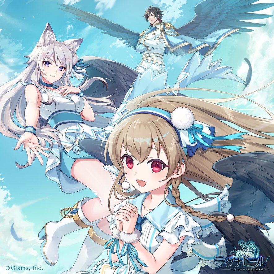 1boy 2girls animal_ears black_feathers black_hair black_wings blue_hairband blue_necktie blue_sky boots braid brown_hair character_request closed_mouth cloud commentary_request company_name copyright_logo copyright_name day dress feathers floating_hair grey_hair hairband hand_on_own_chest high_heel_boots high_heels idol_clothes kurama_tengu_(ragnador) logo long_hair looking_at_viewer multicolored_hair multiple_girls necktie official_alternate_costume official_art outstretched_arm own_hands_clasped own_hands_together purple_eyes ragnador red_eyes red_hair second-party_source short_dress short_hair single_wing sky sleeveless sleeveless_dress smile two-tone_hair white_boots white_dress wings