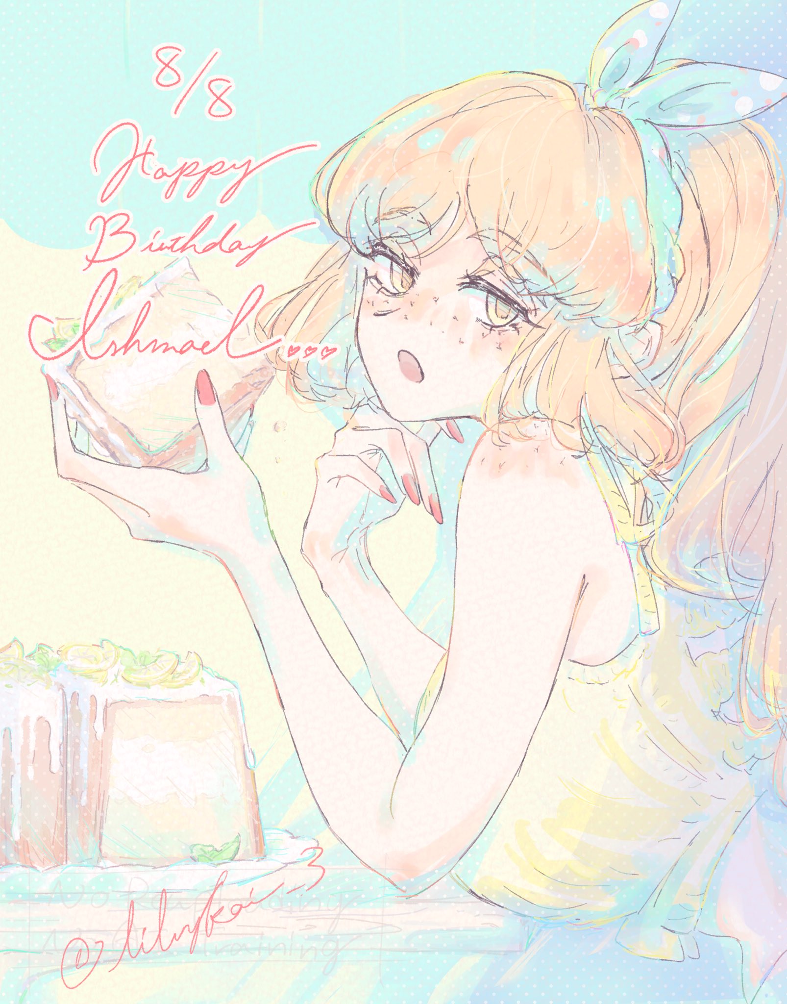 1girl :o alternate_costume blue_background cake cake_slice character_name crop_top dated food freckles hairband happy_birthday highres ishmael_(project_moon) limbus_company long_hair looking_at_viewer lying on_stomach orange_eyes orange_hair ponytail project_moon red_nails riri_(kira0311) shirt simple_background solo upper_body white_hairband yellow_shirt
