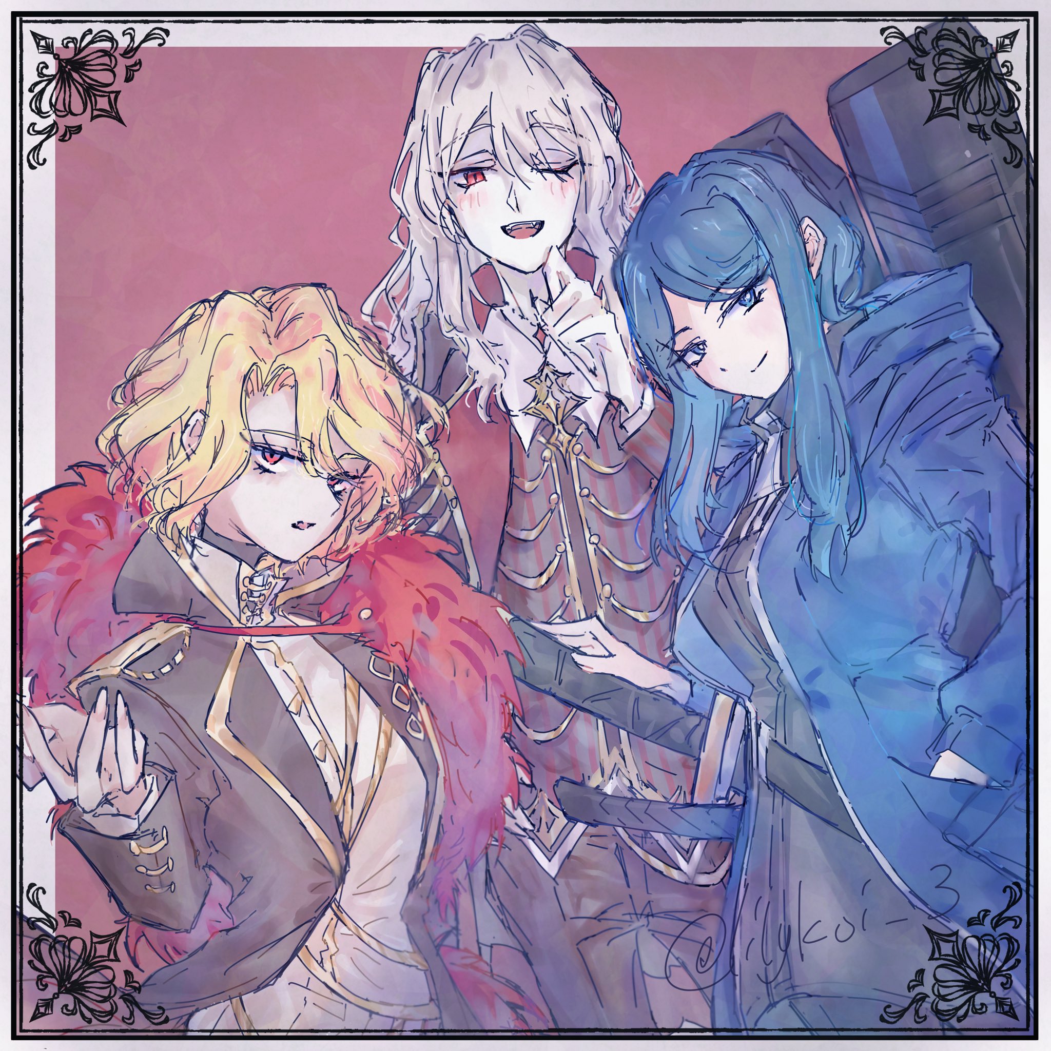 1boy 2girls bari_(project_moon) black_coat black_pants black_vest blonde_hair blue_eyes blue_hair border closed_mouth coat collared_shirt don_quixote_(project_moon) feather_boa gold_trim highres la_manchaland's_don_quixote_(project_moon) limbus_company long_hair long_sleeves looking_at_viewer multiple_girls one_eye_closed open_mouth pants parted_bangs project_moon red_background red_eyes riri_(kira0311) sancho_(project_moon) shirt short_hair sidelocks simple_background standing sword upper_body vest weapon white_border white_hair white_shirt