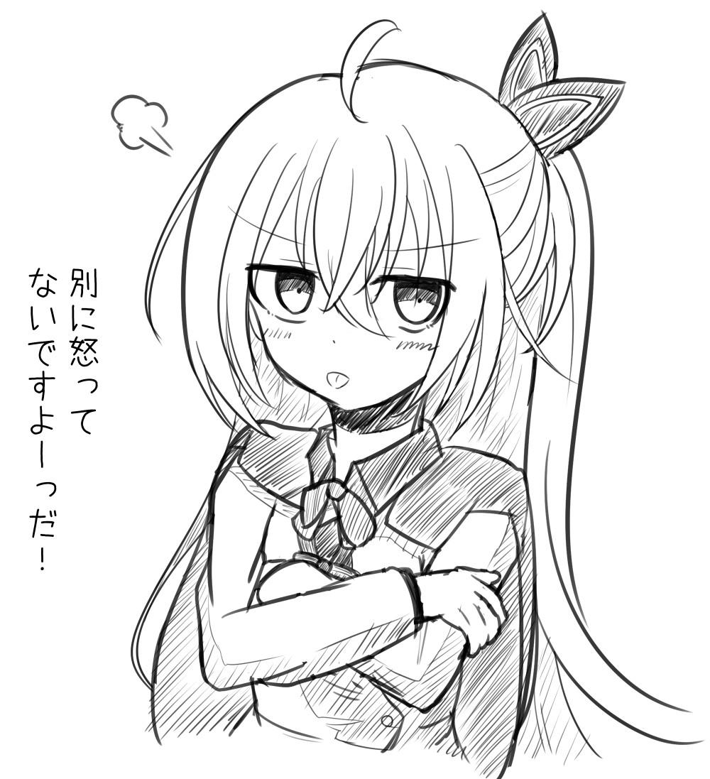 1girl ahoge akizuki_kanna angry black_cape blush bow bowtie cafe_stella_to_shinigami_no_chou cape commentary_request crossed_arms crossed_bangs frown hair_between_eyes hair_bow half_updo jacket long_hair long_sleeves looking_at_viewer monochrome ponytail puff_of_air short_ponytail sidelocks sketch solo tongue tongue_out translated umiasu upper_body v-shaped_eyebrows very_long_hair