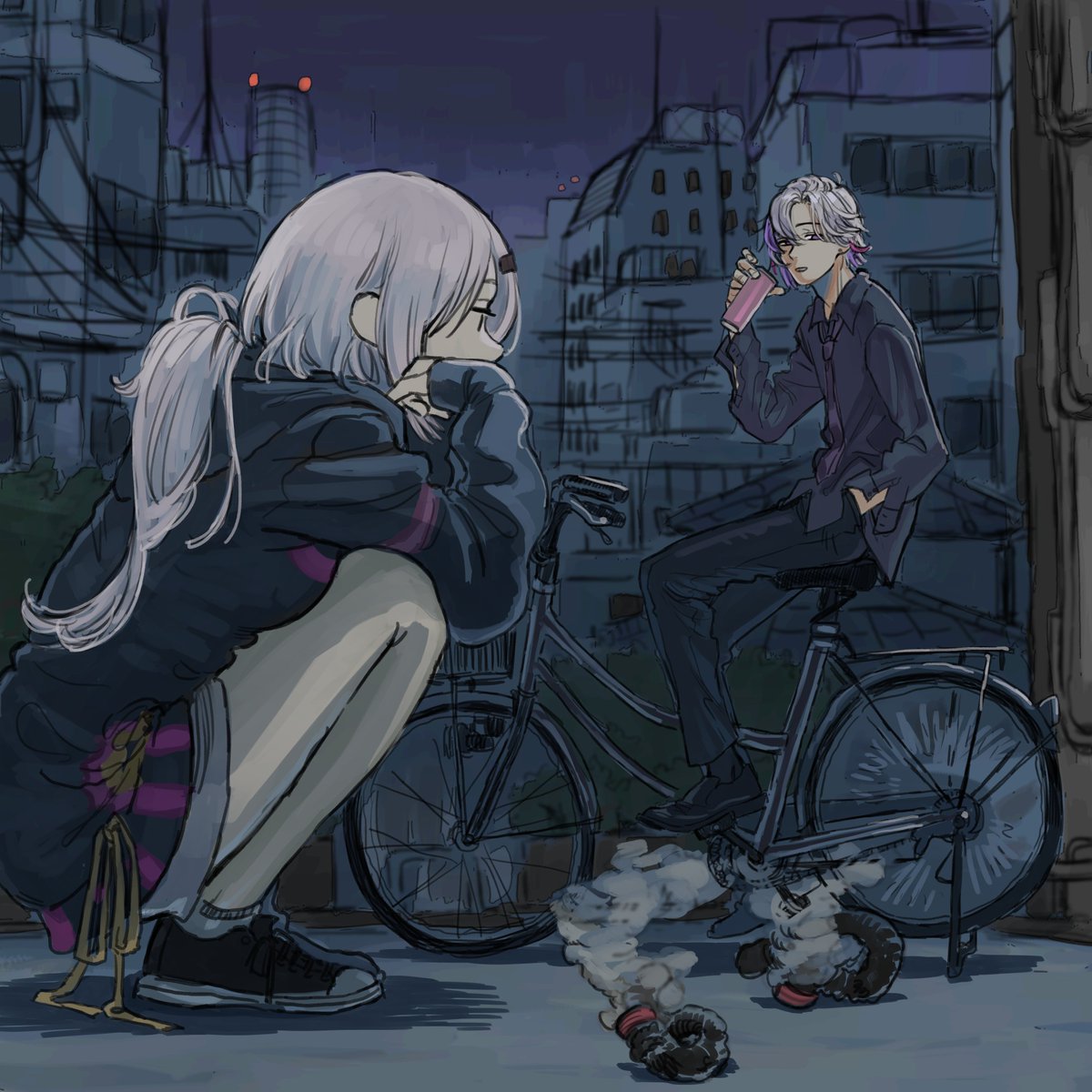 1boy 1girl bicycle black_hoodie black_pants black_shirt black_shoes building collared_shirt fuwa_minato hand_in_pocket highres hood hood_down hoodie koze_niire loafers long_hair long_sleeves low_ponytail multicolored_hair necktie night nijisanji outdoors pants ponytail riding riding_bicycle shiina_yuika shiina_yuika_(2nd_costume) shirt shoes short_hair short_shorts shorts sitting sneakers squatting two-tone_hair virtual_youtuber white_hair white_shorts