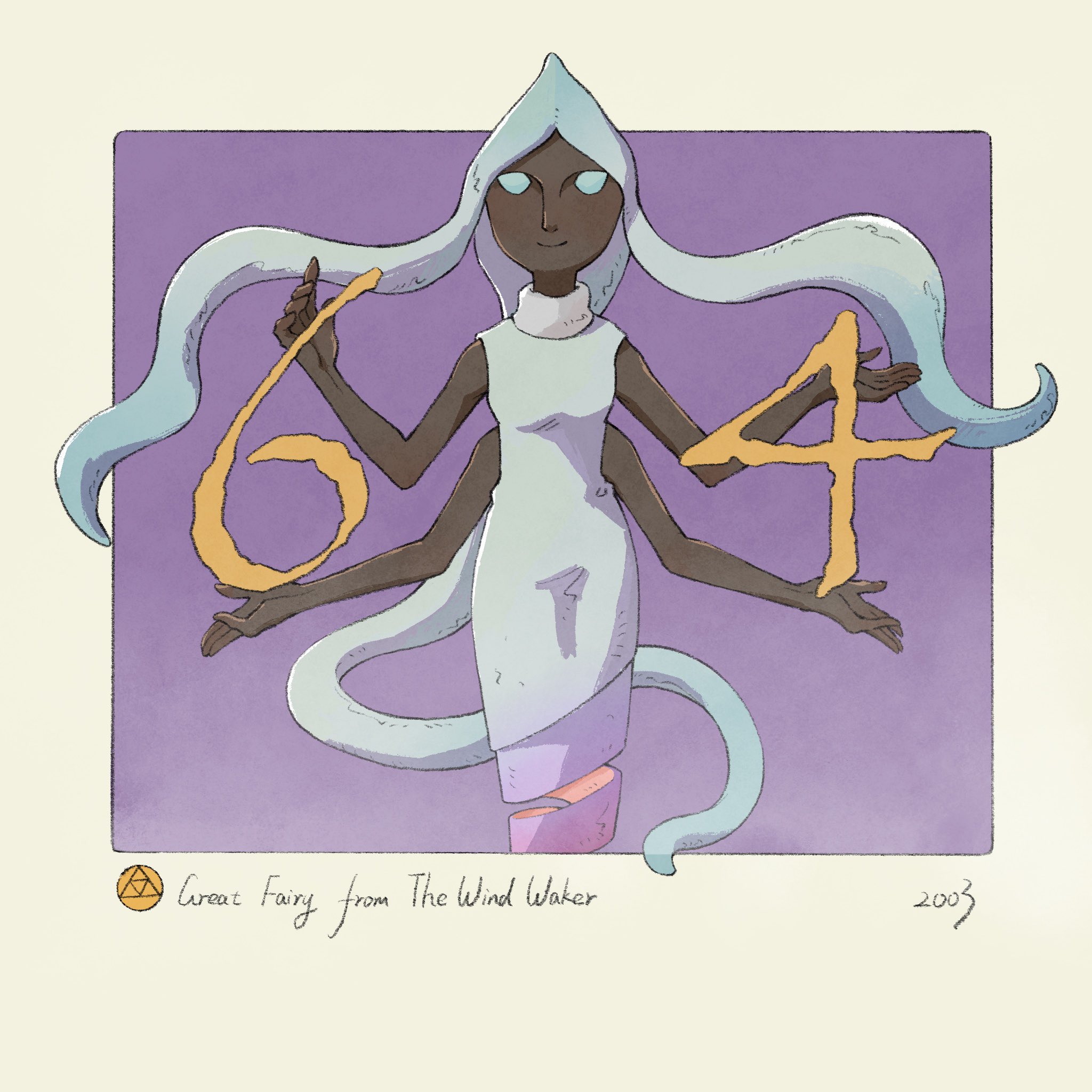1girl blue_dress blue_hair character_name commentary copyright_name dark-skinned_female dark_skin dress empty_eyes english_commentary extra_arms great_fairy_(zelda) highres long_hair looking_at_viewer nintendo purple_background sleeveless solo the_legend_of_zelda the_legend_of_zelda:_the_wind_waker yangyaozigo