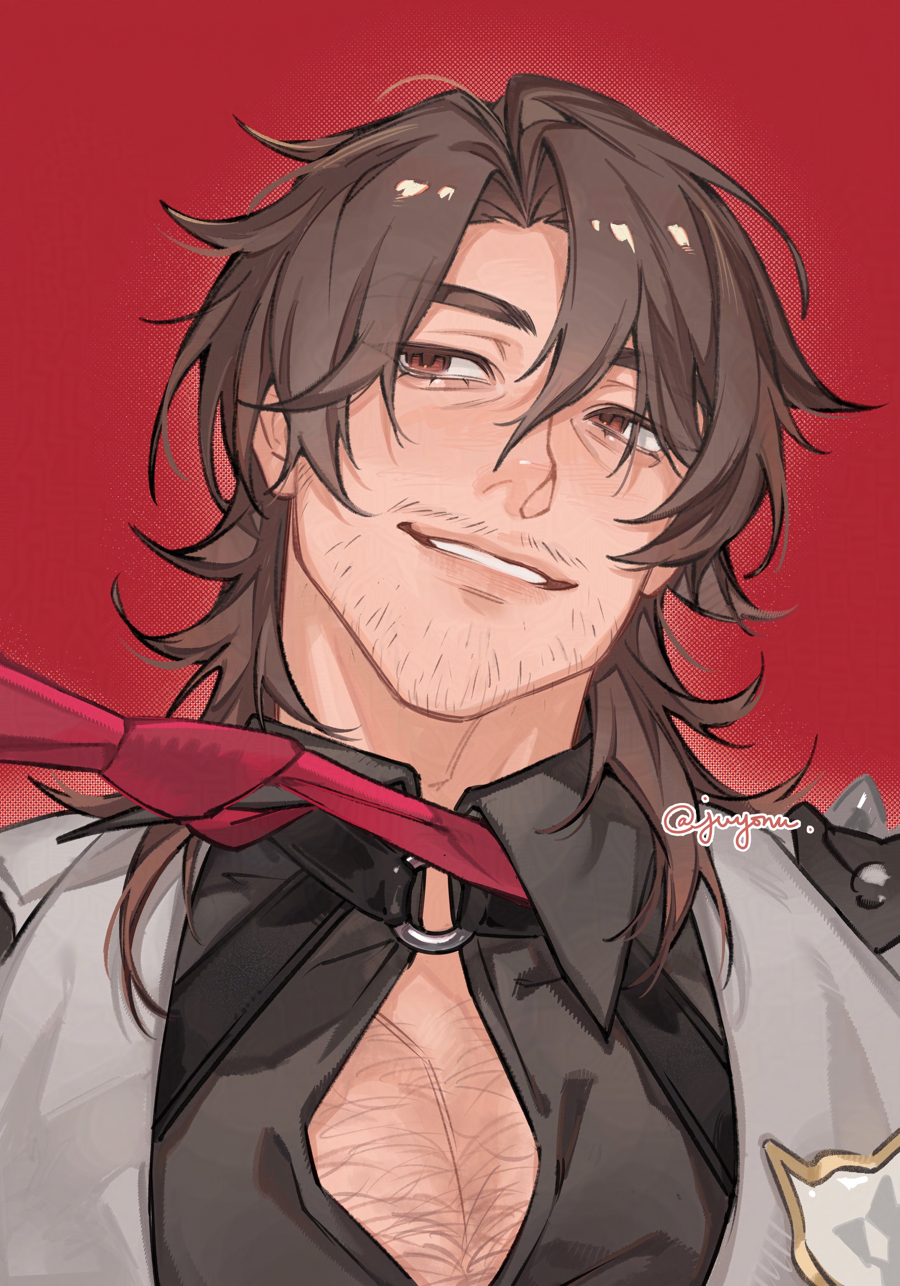 1boy absurdres beard_stubble black_shirt brown_eyes chest_hair collared_shirt facial_hair gallagher_(honkai:_star_rail) grey_jacket grin highres honkai:_star_rail honkai_(series) jacket juyonu looking_to_the_side male_focus medium_hair necktie o-ring open_clothes open_jacket open_shirt parted_bangs parted_hair portrait red_necktie shirt sideways_glance smile solo stubble teeth wing_collar