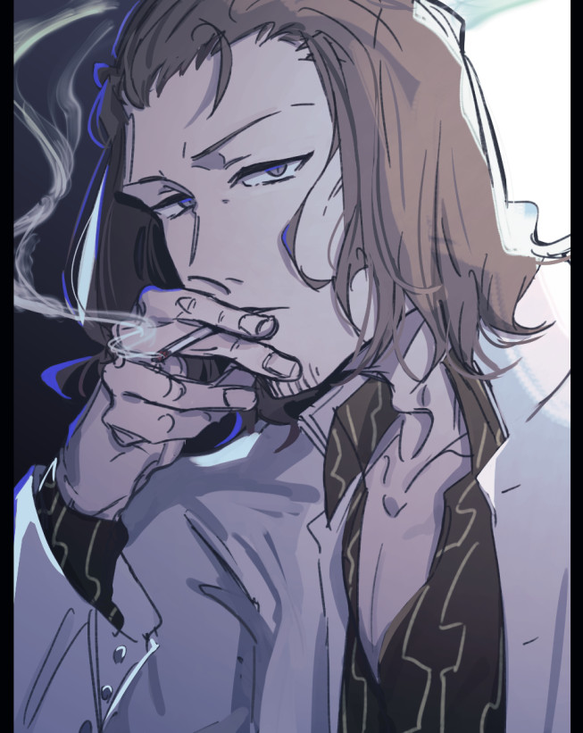 1boy 75sndnbsg adapted_costume black_shirt bleach blue_eyes brown_hair cigarette collared_shirt coyote_starrk facial_hair forehead hand_up holding holding_cigarette jacket long_sleeves looking_at_viewer male_focus mature_male medium_hair nose open_clothes open_jacket parted_lips shirt sidelighting simple_background sketch smoke smoking solo stubble tsurime upper_body v-shaped_eyebrows white_jacket