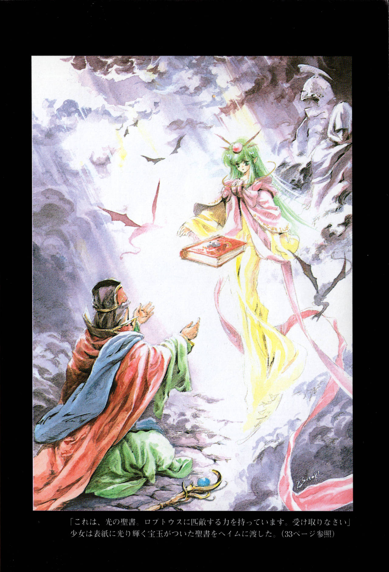 1boy 1girl 2others book book_of_naga dragon fire_emblem fire_emblem:_genealogy_of_the_holy_war floating floating_object gem green_eyes green_hair heim_(fire_emblem) highres kneeling long_hair multiple_others naga_(fire_emblem) nintendo official_art pointy_ears scan signature staff suzuki_rika third-party_source translated wyvern