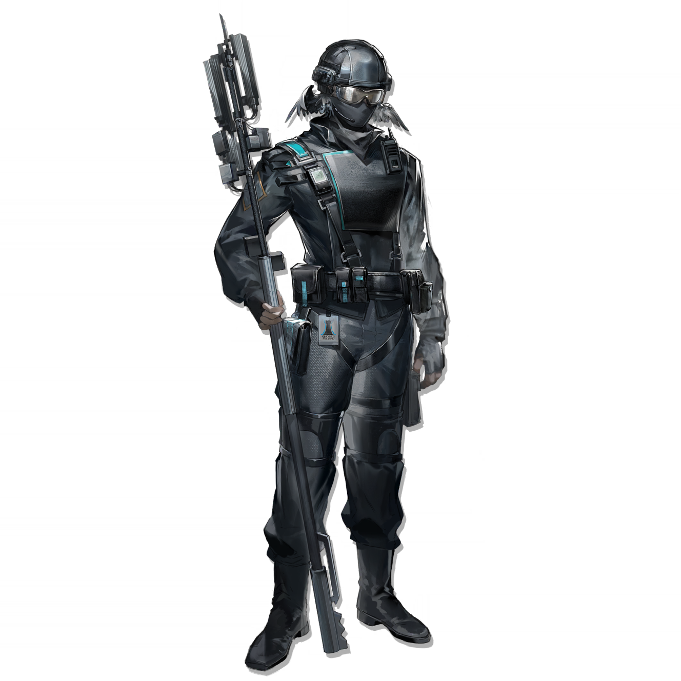 1boy arknights bandana bandana_over_mouth black_jacket covered_face drop_shadow faceless faceless_male feather_hair full_body goggles helmet highres holding holding_staff holding_weapon jacket male_focus official_art reserve_operator_supporter_(arknights) rhodes_island_logo_(arknights) rhodes_island_uniform simple_background solo staff standing tachi-e tactical_clothes third-party_source transparent_background walkie-talkie weapon yuji_(fantasia)