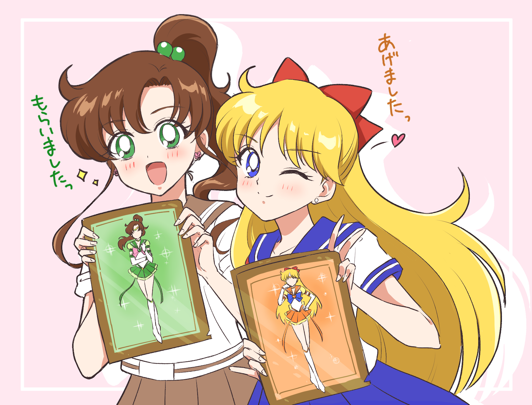 2girls aino_minako bishoujo_senshi_sailor_moon blonde_hair blue_bow blue_bowtie blue_eyes blue_sailor_collar boots bow bowtie brown_hair brown_sailor_collar brown_skirt earrings flower_earrings green_eyes green_skirt hair_bobbles hair_bow hair_ornament highres holding_portrait jewelry kino_makoto kino_makoto's_school_uniform long_hair looking_at_viewer multiple_girls one_eye_closed pink_bow pink_bowtie ponytail portrait_(object) red_bow ribbon sailor_collar sailor_jupiter sailor_venus school_uniform serafuku skirt smile stud_earrings super_sailor_jupiter super_sailor_venus translation_request v white_boots zakupiyo