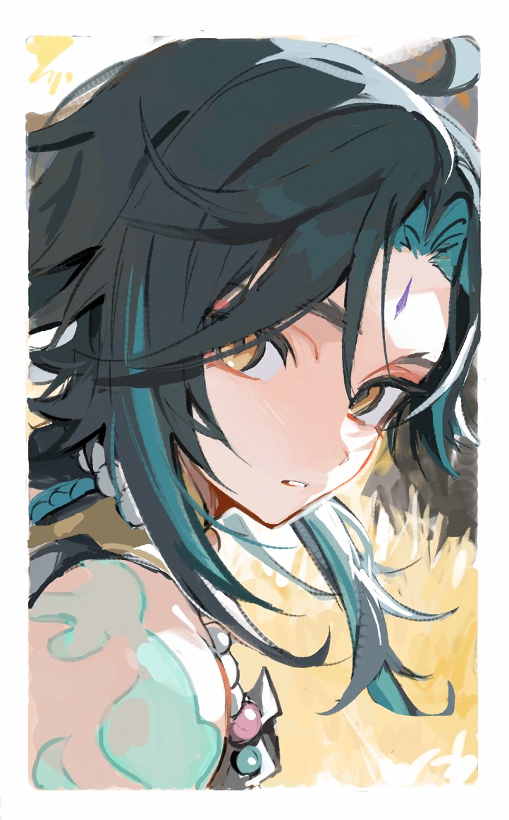 1boy arm_tattoo bead_necklace beads black_hair blue_hair facial_mark forehead_mark genshin_impact jewelry kaawaisann looking_at_viewer male_focus multicolored_hair necklace orange_eyes parted_lips simple_background solo tattoo upper_body xiao_(genshin_impact)
