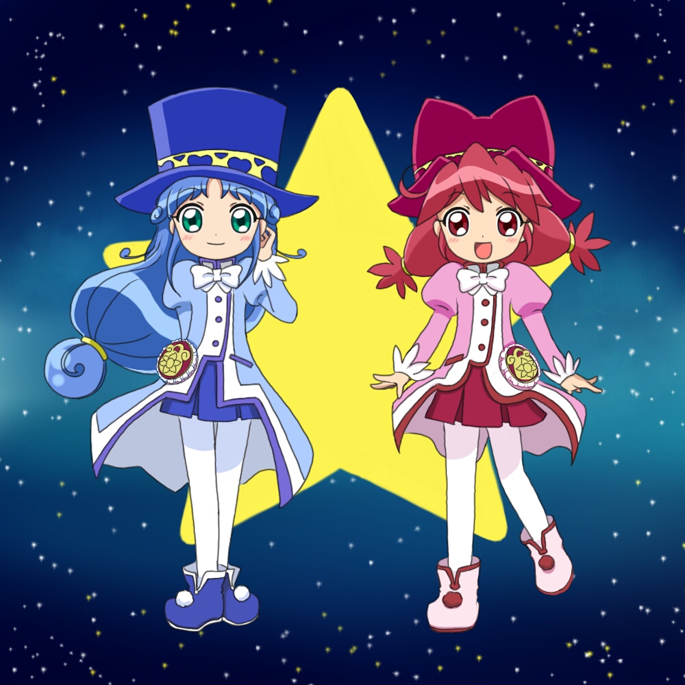2girls :d ahoge arm_behind_back arms_at_sides blue_boots blue_coat blue_hair blue_hat blue_skirt blue_sky blush boots bow bowtie buttons closed_mouth coat commentary crest curly_hair dot_nose fine_(futagohime) foot_up full_body fushigiboshi_no_futago_hime gradient_sky green_eyes hand_up hat igloo_(a_yull) legs_together long_hair long_sleeves looking_at_viewer low-tied_long_hair low_twintails matching_outfits medallion miniskirt multiple_girls open_mouth overcoat pantyhose pink_boots pink_coat pleated_skirt pom_pom_(clothes) pom_pom_footwear puffy_long_sleeves puffy_sleeves red_eyes red_hair red_hat red_skirt rein_(futagohime) siblings side-by-side sisters skirt sky smile standing star_(sky) star_(symbol) star_symbol_background starry_sky top_hat tucking_hair twins twintails white_bow white_bowtie white_pantyhose