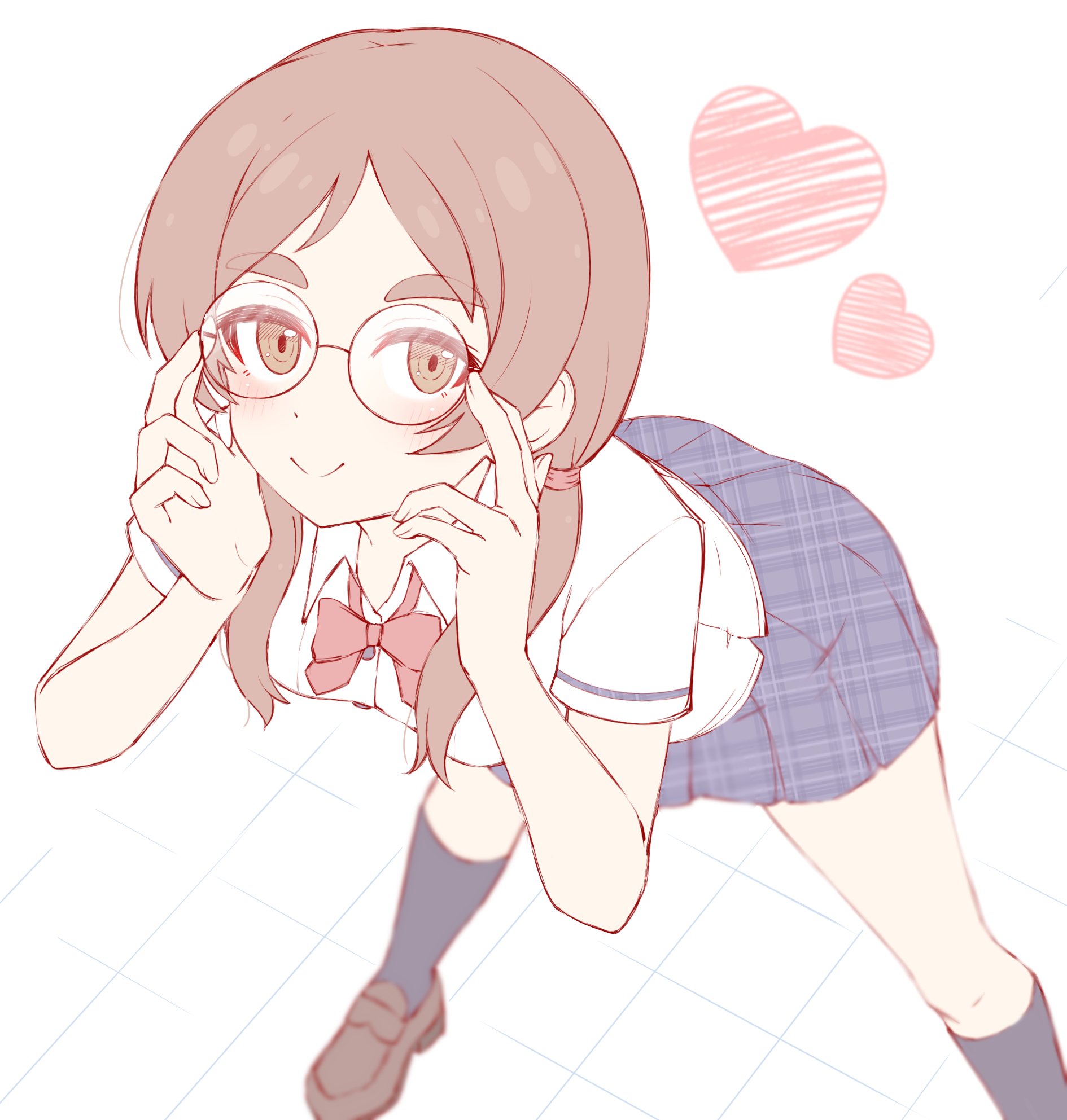 1girl adjusting_eyewear black_socks blue_skirt blush bow bowtie breasts brown_eyes brown_hair brown_shoes closed_mouth dot_nose floor foot_out_of_frame glasses hands_up heart highres iceman_(iceman550787) idolmaster idolmaster_million_live! idolmaster_million_live!_theater_days leaning_forward light_smile loafers looking_at_viewer loose_bowtie medium_breasts nanao_yuriko's_friend open_collar plaid_clothes plaid_skirt pleated_skirt red_bow red_bowtie round_eyewear school_uniform shirt shoes simple_background skirt socks solo standing thick_eyebrows white_background white_shirt