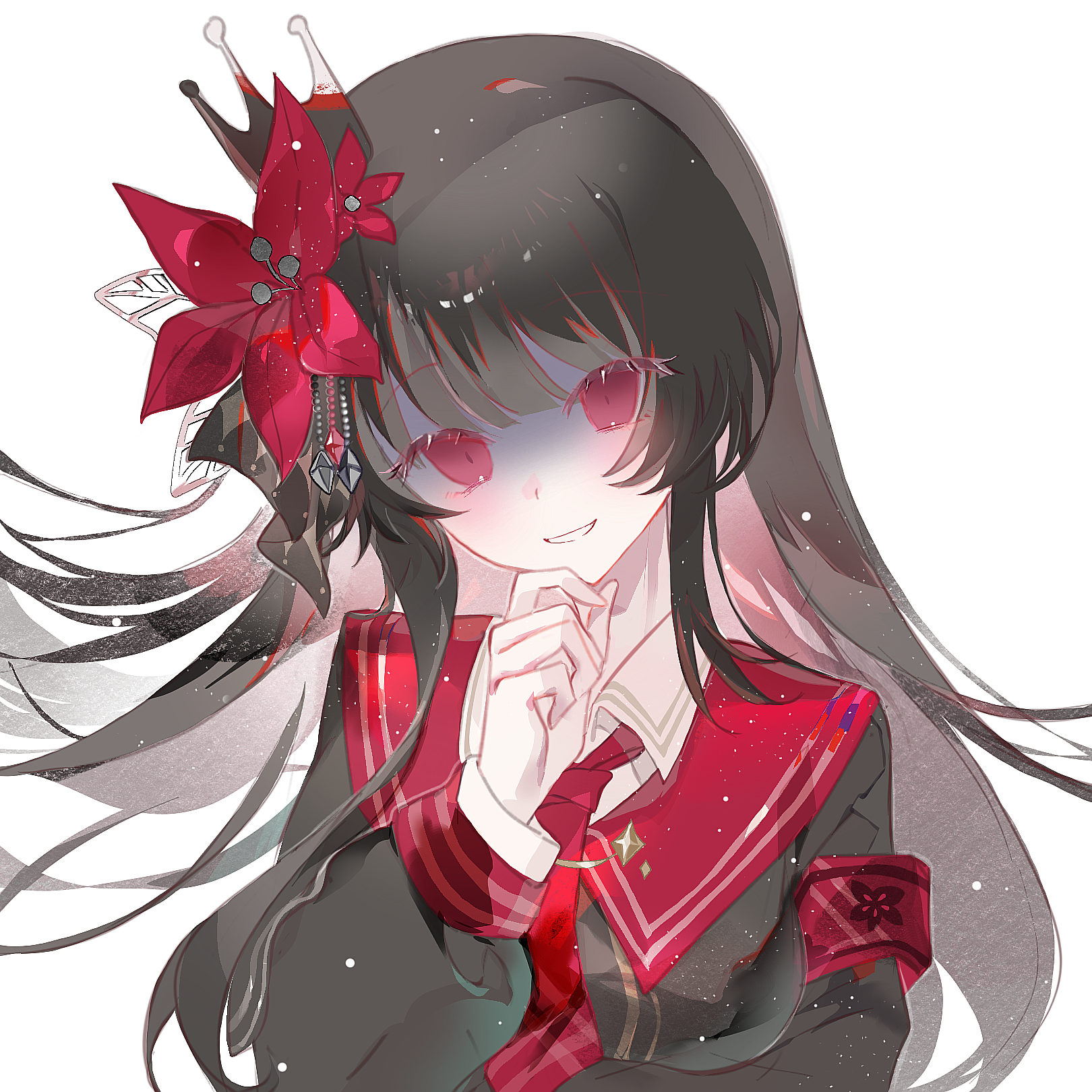 1girl armband black_hair black_shirt blunt_bangs collared_shirt commentary crown flower hair_flower hair_ornament hand_on_own_chin hand_up highres jiayun94769 long_hair long_sleeves looking_at_viewer magical_girl mahou_shoujo_no_majo_saiban necktie nikaido_hiro red_armband red_eyes red_flower red_necktie shaded_face shirt simple_background smile solo untranslatable_commentary upper_body white_background