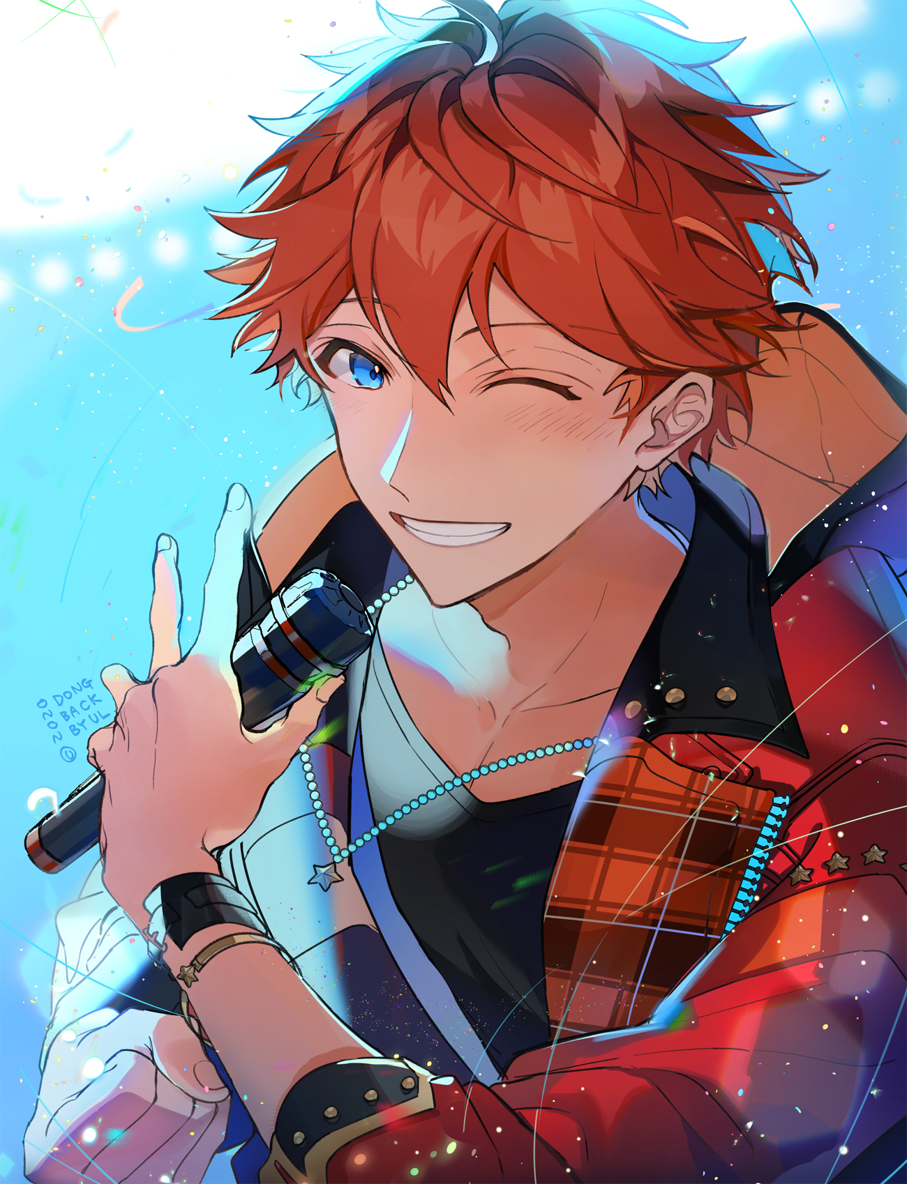 1boy akehoshi_subaru bead_necklace beads blue_eyes clenched_hand dongbackbyul ensemble_stars! hair_between_eyes highres holding holding_microphone jacket jewelry light_particles long_sleeves male_focus microphone necklace official_alternate_costume one_eye_closed open_clothes open_jacket orange_hair orange_jacket short_hair smile solo upper_body