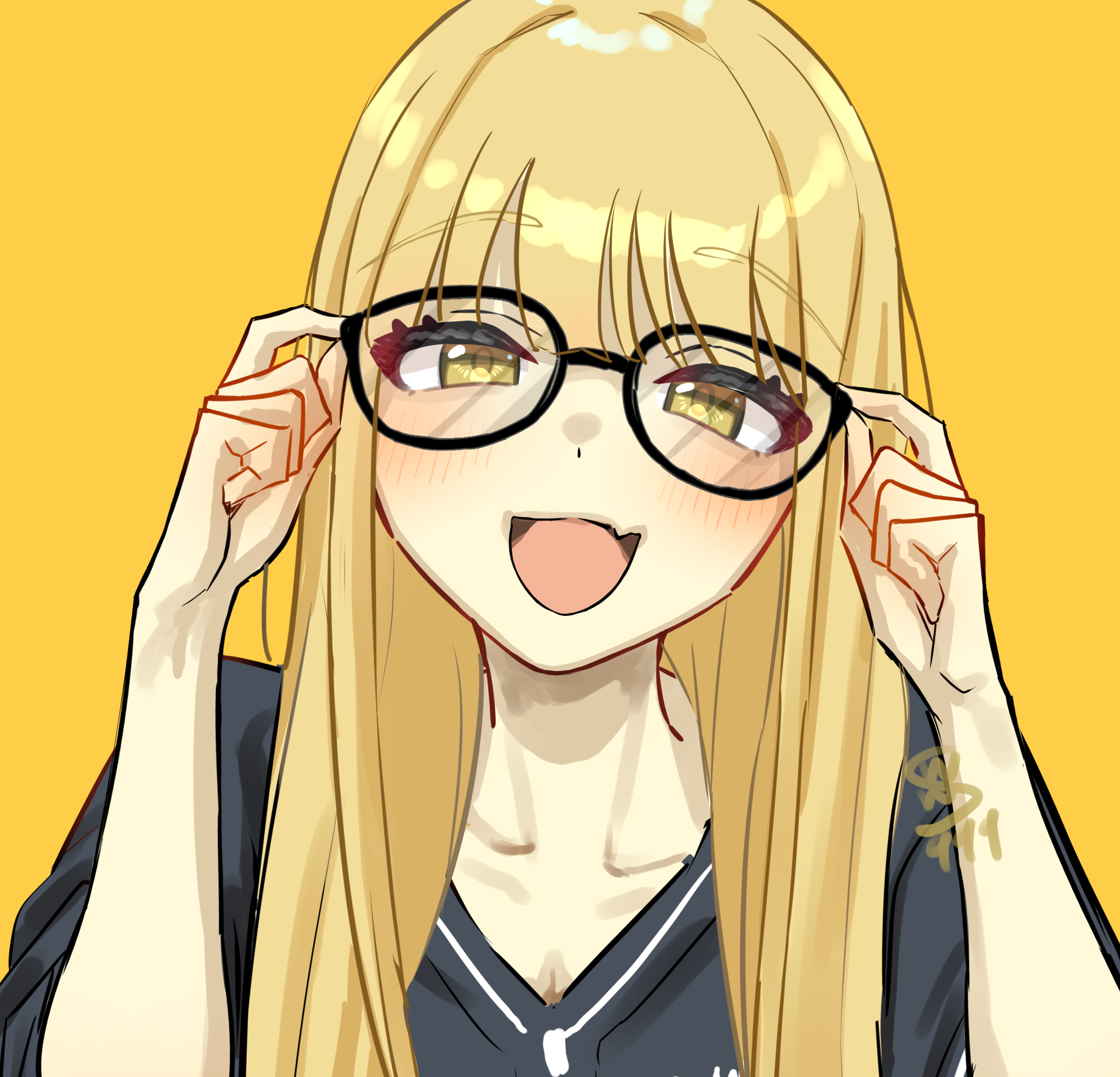 1girl bespectacled black-framed_eyewear black_shirt blonde_hair blunt_bangs blush collarbone commentary_request fang fujita_kotone gakuen_idolmaster glasses hair_down highres idolmaster long_hair looking_at_viewer official_alternate_costume shirt signature simple_background skin_fang smile solo straight_hair upper_body wasawa_(wsw_999) yellow_background yellow_eyes