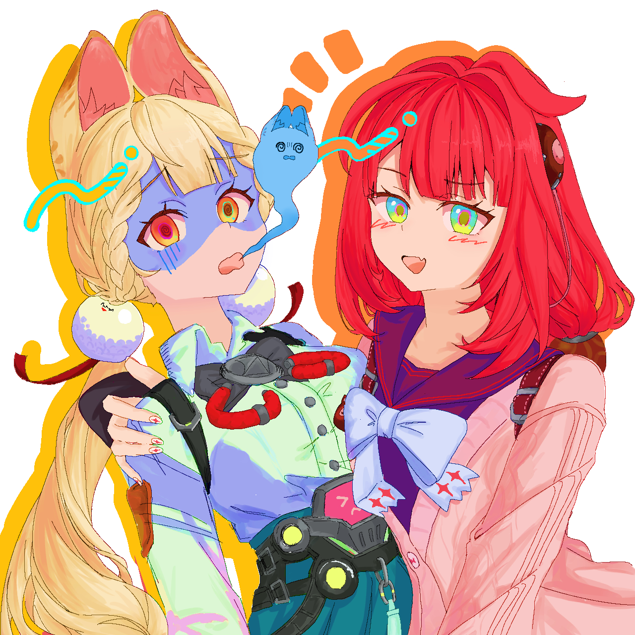 2girls alice_thymefield animal_ears blonde_hair braid braided_twintails breasts hair_ornament hearing_aid heterochromia highres long_hair looking_at_viewer low_twintails multiple_girls rabbit_ears rabbit_girl red_eyes shirt sphere_hair_ornament twintails ukinami_yuzuha white_shirt yellow_eyes yuzu_koshou_(moyashi86) zenless_zone_zero