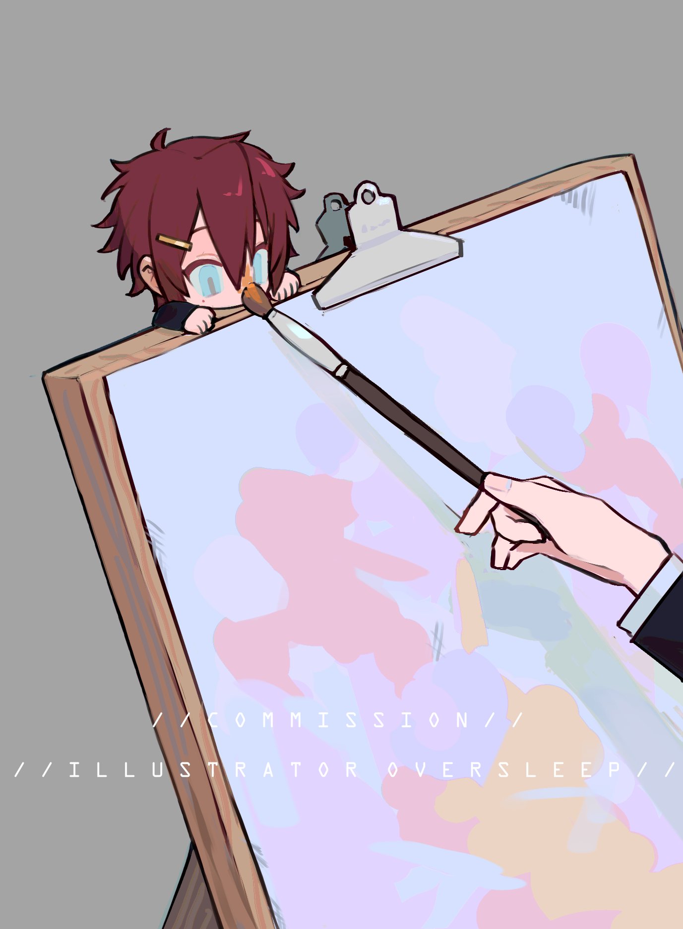1boy blue_eyes canvas_(object) chibi chibi_only easel english_text grey_background hair_between_eyes hair_ornament hairclip highres holding holding_paintbrush long_sleeves male_focus mini_person miniboy original oversleep paintbrush painting_(action) red_hair short_hair simple_background