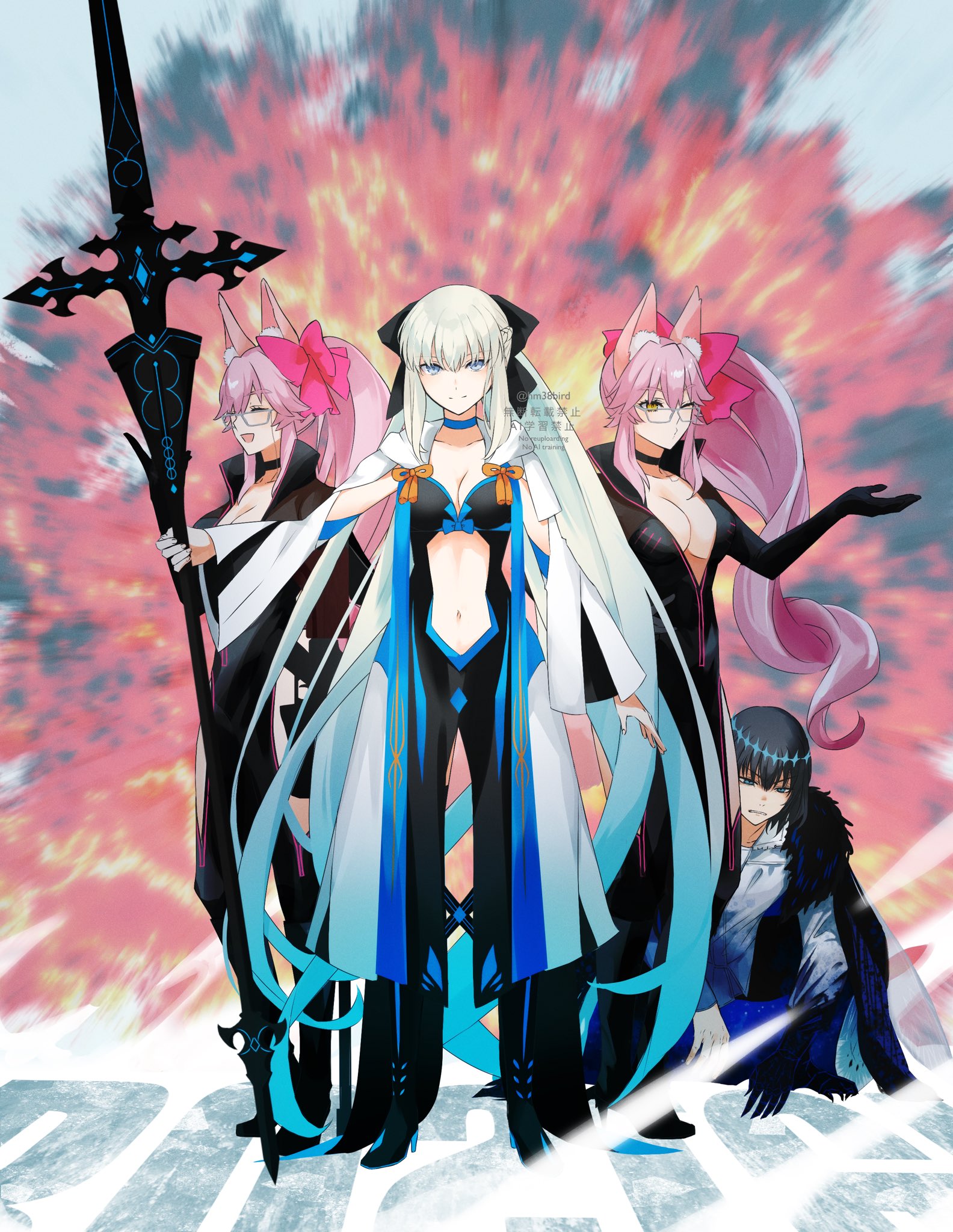 1boy 3girls black_hair blue_eyes blush bow closed_eyes fate/grand_order fate_(series) fur_trim glasses hair_between_eyes hair_bow highres holding holding_polearm holding_weapon koyanskaya_(assassin)_(first_ascension)_(fate) koyanskaya_(fate) long_sleeves looking_at_viewer morgan_le_fay_(fate) morgan_le_fay_(second_ascension)_(fate) multiple_girls nakanohiro oberon_(fate) oberon_(third_ascension)_(fate) open_mouth pink_hair polearm ponytail shirt short_hair sitting smile standing weapon white_hair yellow_eyes