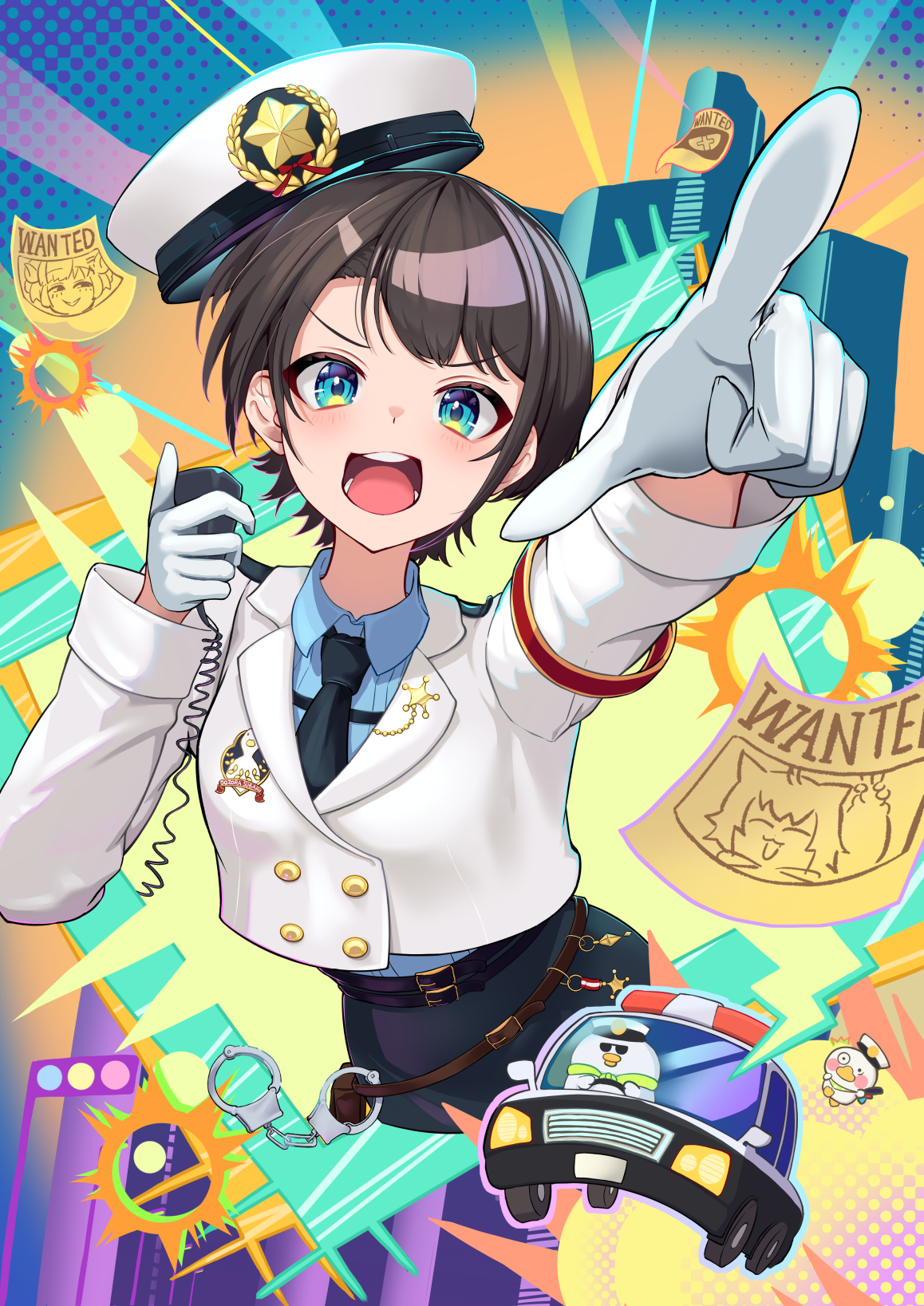1girl armband belt black_belt black_hair black_necktie black_skirt blue_eyes blue_shirt buttons car collared_shirt commentary_request cropped_jacket cuffs double-breasted gloves gold_buttons hand_up handcuffs hareteruya hat high-waist_skirt highres holding hololive jacket looking_at_viewer motor_vehicle necktie nekomata_okayu official_alternate_costume oozora_subaru oozora_subaru_(police) open_mouth outstretched_arm peaked_cap pointing pointing_forward police police_car police_hat police_uniform policewoman shirt short_hair skirt solo subatomo_(big) subatomo_(small) swept_bangs tsunomaki_watame v-shaped_eyebrows virtual_youtuber wanted_poster white_gloves white_hat white_jacket