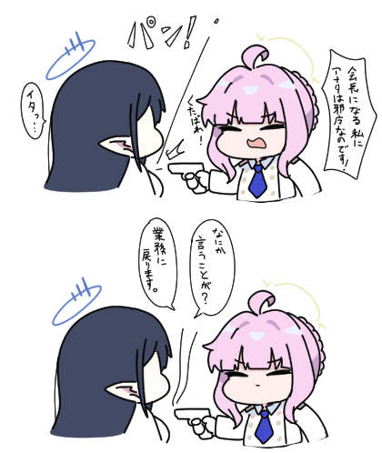 2girls ahoge black_hair blue_archive blue_necktie braid chibi closed_eyes closed_mouth commentary_request cropped_torso firing gun halo holding holding_gun holding_weapon jacket kaya_(blue_archive) long_hair lowres multiple_girls necktie nyaru_(nyaru_4126) open_mouth pink_hair pointy_ears rin_(blue_archive) simple_background smoke smoking_barrel translation_request upper_body wavy_mouth weapon white_background white_jacket