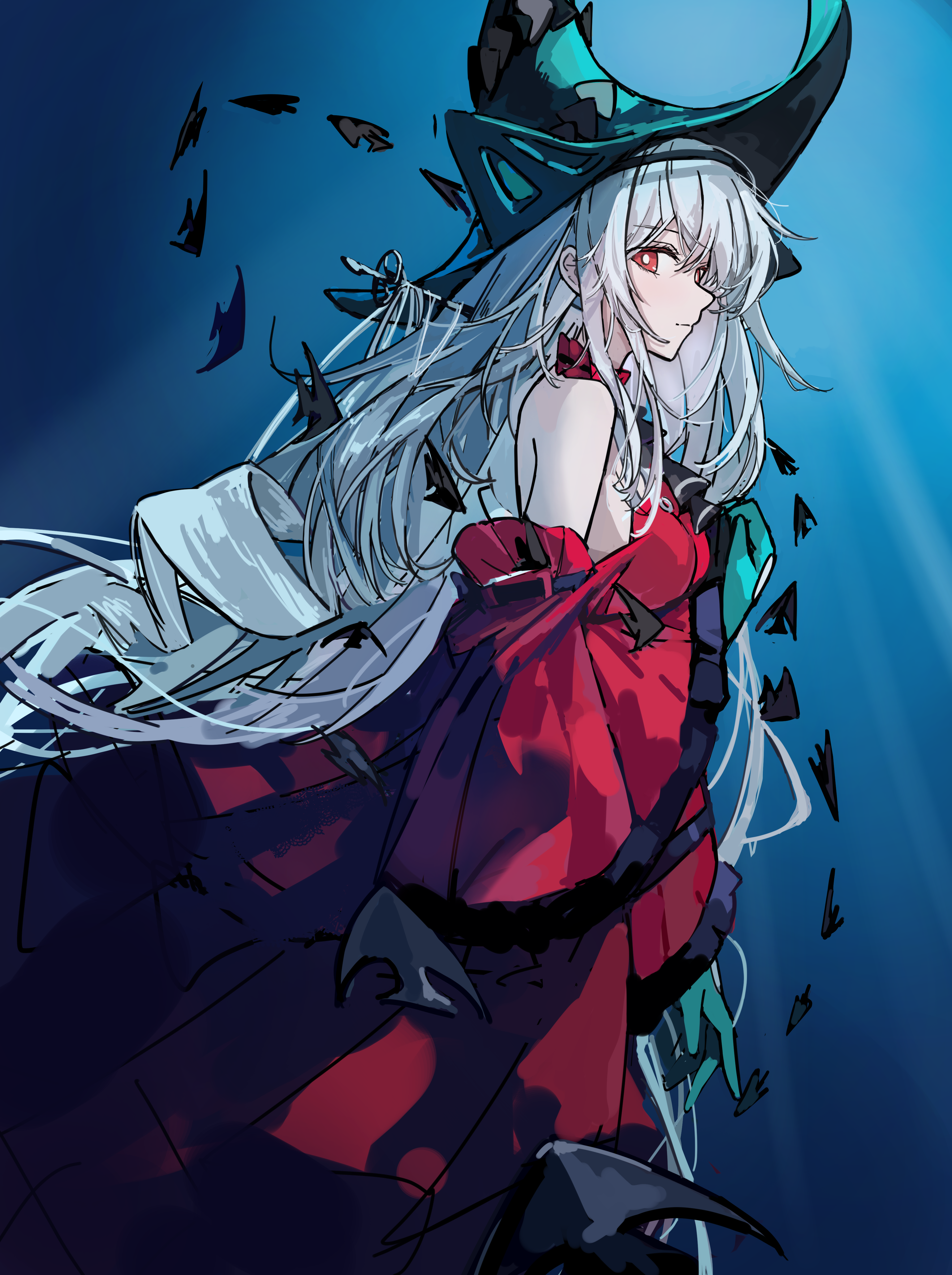 1girl absurdres angelfish aqua_gloves aqua_hat arknights ascot bare_shoulders black_ascot breasts closed_mouth cowboy_shot detached_sleeves dress fish floating_hair gloves hair_between_eyes hair_ornament halterneck hat highres lemoz light_rays long_hair long_sleeves looking_at_viewer looking_to_the_side medium_breasts off-shoulder_dress off_shoulder official_alternate_costume profile red_dress red_eyes red_sleeves ribbon shadow skadi_(arknights) skadi_the_corrupting_heart_(arknights) solo tropical_fish underwater very_long_hair white_hair
