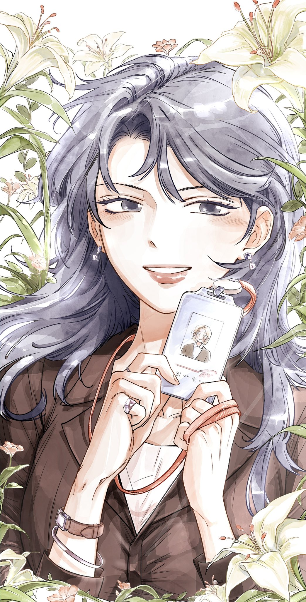 1girl black_shirt blush bracelet commentary_request curtained_hair earrings flower grey_eyes grey_hair grin hands_up highres holding holding_id_card id_card jewelry korean_commentary lily_(flower) long_hair long_sleeves looking_at_viewer original pobae_hoho red_lips ring shirt smile solo upper_body watch wristwatch yellow_flower