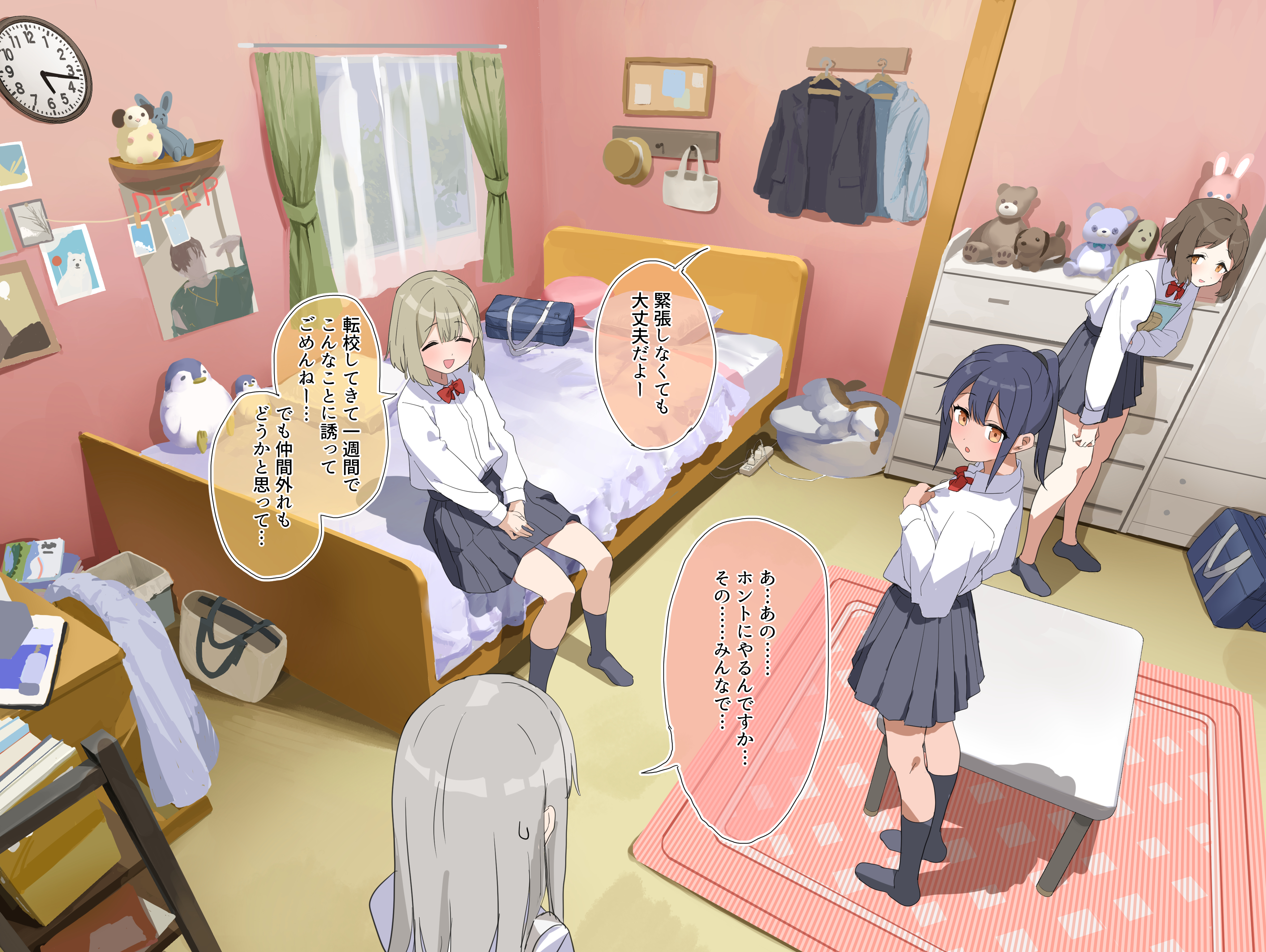 4girls :o absurdres ahoge analog_clock bag bed bedroom blush bow bowtie brown_hair chest_of_drawers clock closed_eyes commentary_request curtains grey_hair grey_skirt grey_socks highres indoors lemontyoisy_r18 long_hair long_sleeves looking_at_another multiple_girls no_shoes on_bed open_mouth original pleated_skirt ponytail red_bow red_bowtie rug school_bag school_uniform shirt shirt_tucked_in short_hair sidelocks sitting skirt smile socks speech_bubble standing stuffed_animal stuffed_toy sweat sweatdrop table translation_request white_shirt window