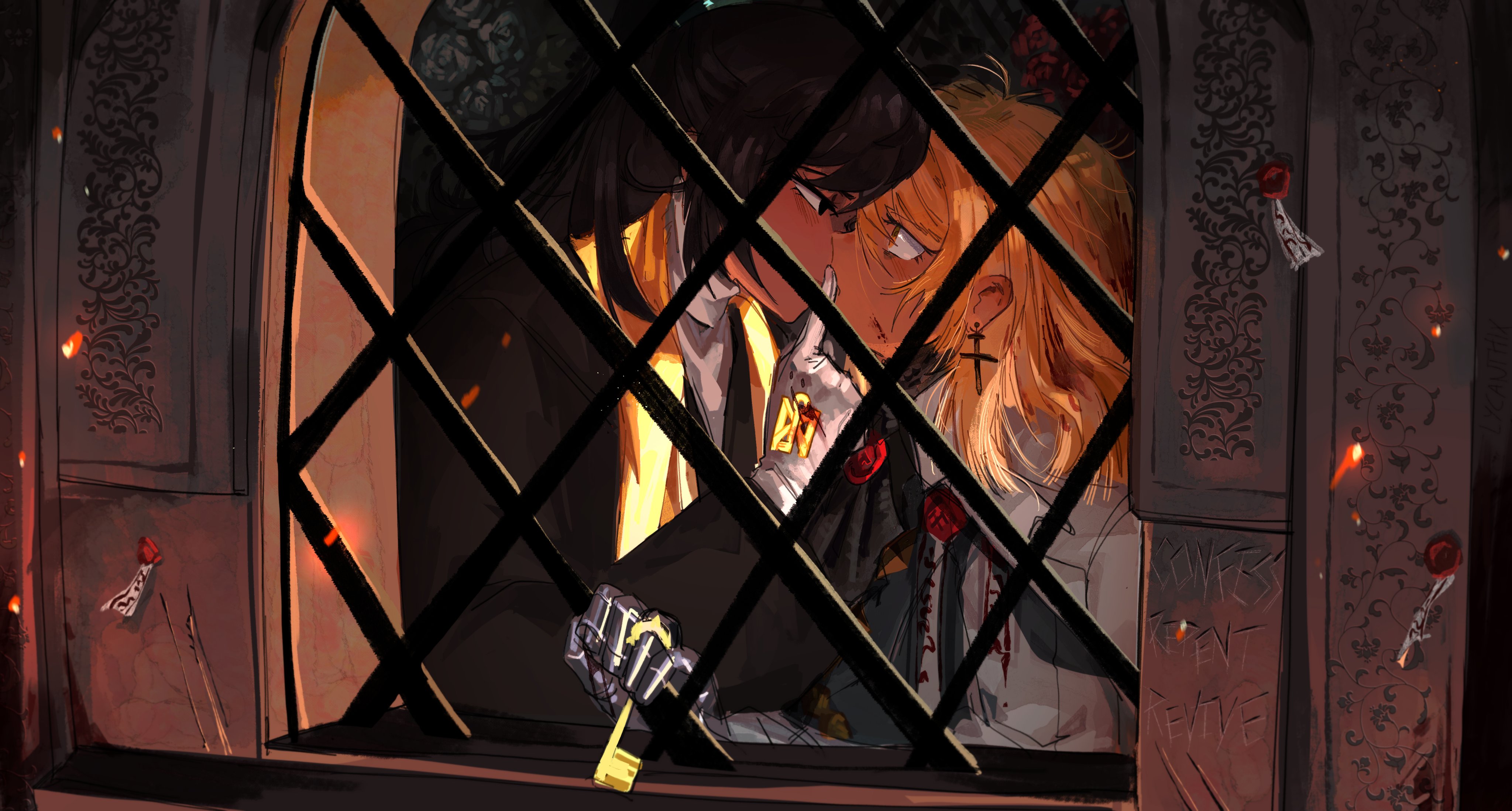 2boys absurdres alternate_hair_length alternate_hairstyle black_coat black_eyes black_hair blonde_hair blood blood_on_face coat dieci_association_south_uniform earrings embers gauntlets gloves highres hong_lu_(project_moon) indoors jewelry key kiss limbus_company long_hair long_sleeves looking_at_another lycanthix male_focus medium_hair multiple_boys n_corp._fanatic_(identity)_(project_moon) project_moon shirt sinclair_(project_moon) upper_body wax_seal white_gloves white_shirt window yaoi yellow_eyes yellow_stole