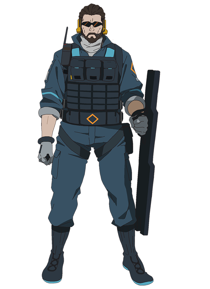1boy ace_(arknights) anime_coloring arknights beard blue_boots blue_jacket blue_pants boots brown_hair bulletproof_vest closed_mouth collared_jacket collared_shirt facial_hair full_body gloves holding holding_shield jacket long_sleeves looking_at_viewer male_focus mature_male official_art pants shield shirt short_hair simple_background sleeves_rolled_up solo standing sunglasses takafuji_aya transparent_background turtleneck turtleneck_shirt white_gloves white_shirt