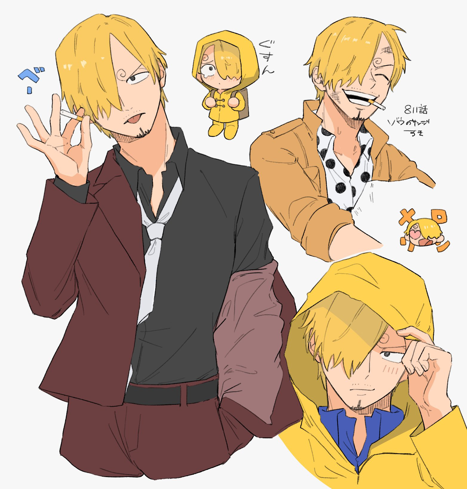 1boy black_shirt blonde_hair blue_shirt brown_jacket cigarette commentary_request cropped_torso curly_eyebrows dirty dirty_face facial_hair goatee hair_over_one_eye heart heart-shaped_eyes highres holding holding_cigarette iqracha jacket male_focus mouth_hold multiple_views mustache_stubble necktie one_piece polka_dot polka_dot_shirt raincoat sanji_(one_piece) shirt short_hair smoking stubble teeth_hold white_background white_necktie yellow_raincoat