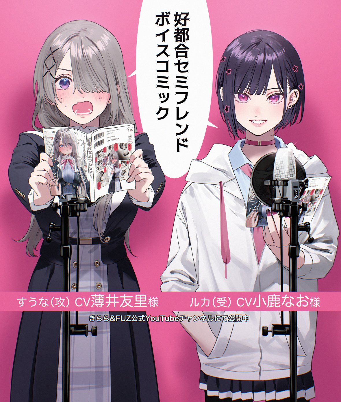 2girls black_dress black_hair black_nails blush chigusa_minori choker commentary_request dress gradient_nails grey_hair grey_skirt hair_ornament hair_over_one_eye hamanasu_ruka highres hood hood_down hooded_jacket jacket koutsugou_semi-friend kuruma_suuna long_sleeves microphone microphone_stand multiple_girls nail_polish nervous_sweating open_mouth pink_choker pink_eyes pleated_skirt pop_filter purple_nails shared_speech_bubble skirt speech_bubble star_(symbol) star_hair_ornament sweat translation_request white_jacket x_hair_ornament yuri_(object)