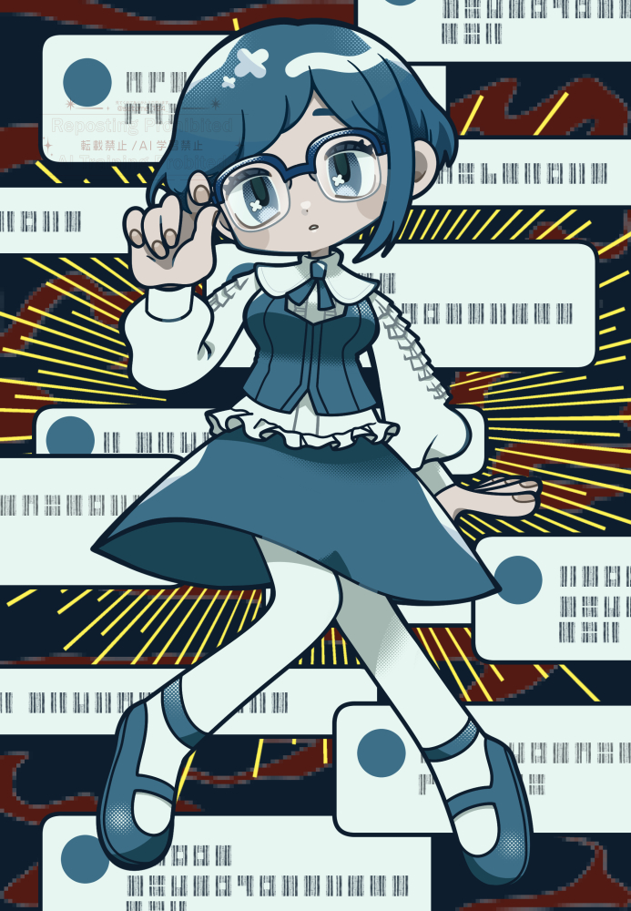 1girl adjusting_eyewear blue_eyes blue_hair blue_ribbon blue_shoes blue_skirt breasts collared_shirt commentary_request frilled_shirt frills fukurai_azami full_body glasses hand_on_eyewear long_sleeves looking_at_viewer medium_breasts neck_ribbon pantyhose ribbon satome_(min) shirt shoes short_hair skirt solo standing text_messaging toshi_densetsu_kaitai_center white_pantyhose white_shirt