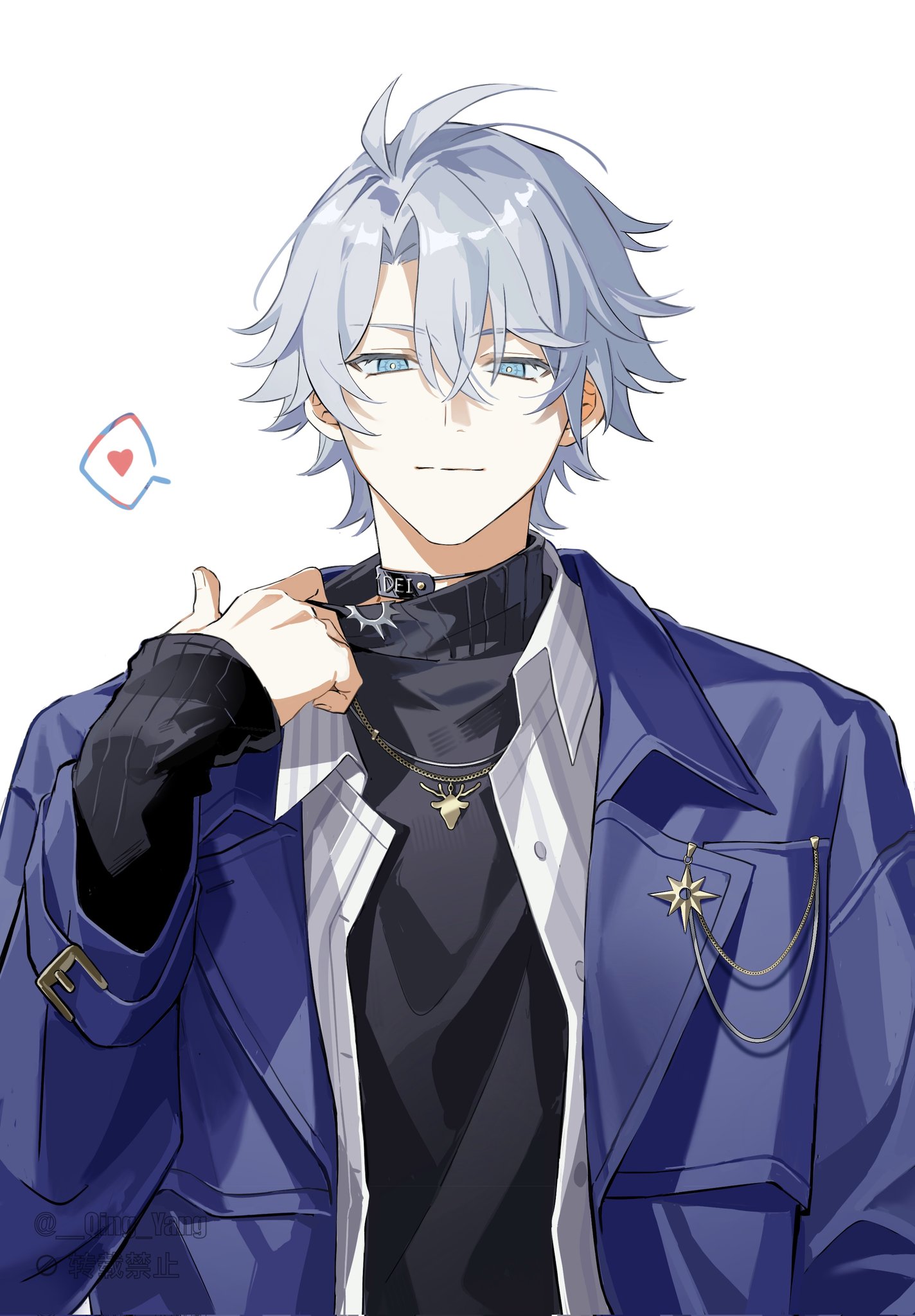 1boy alternate_costume antenna_hair blue_eyes buttons collared_shirt curtained_hair deer_necklace grey_hair heart high_collar highres honkai:_star_rail honkai_(series) jewelry light_smile long_sleeves looking_at_viewer male_focus necklace oh_qing_yang phainon_(honkai:_star_rail) phainon_(luckin_coffee)_(honkai:_star_rail) pocket shirt short_hair simple_background solo spoken_heart striped_clothes striped_shirt upper_body vertical-striped_clothes vertical-striped_shirt white_background