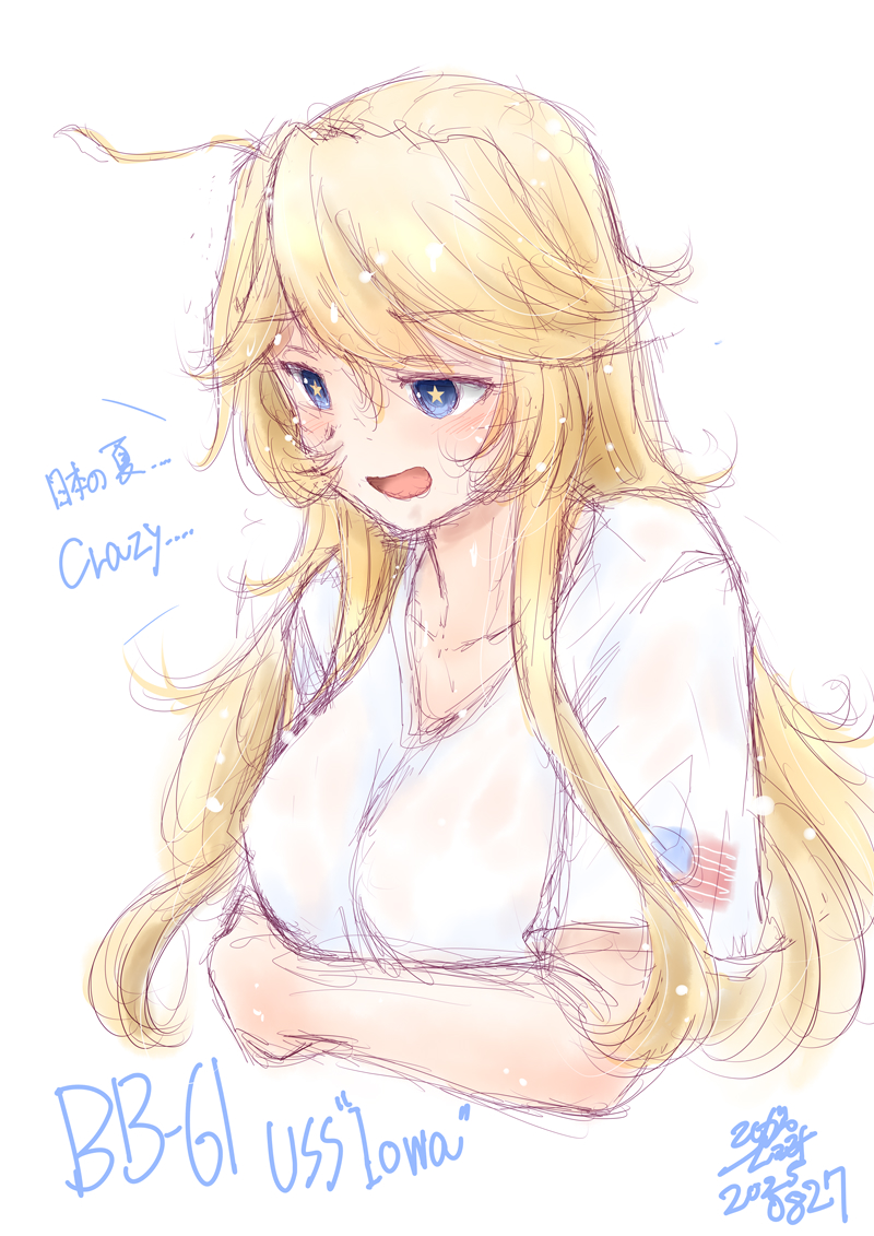 1girl ahoge alternate_costume blonde_hair blue_eyes breasts character_name collarbone commentary_request english_text iowa_(kancolle) kantai_collection koshigaya_tatsumi large_breasts long_hair one-hour_drawing_challenge shirt simple_background solo star-shaped_pupils star_(symbol) symbol-shaped_pupils t-shirt upper_body white_background white_shirt