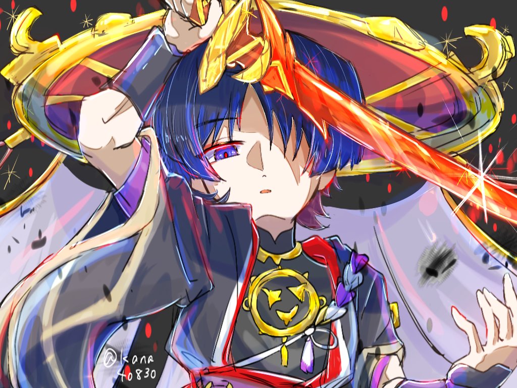 1boy arm_up armor black_background black_bodysuit black_sleeves blunt_ends bodysuit furisode genshin_impact gold gold_trim hair_over_one_eye hand_up hat holding holding_weapon japanese_armor japanese_clothes jingasa kana40830 kimono kote kurokote layered_sleeves looking_at_viewer male_focus mandarin_collar mitsudomoe_(shape) o-ring open_hand open_mouth partially_shaded_face purple_eyes purple_hair purple_rope purple_sash purple_sleeves red_hat red_pupils red_sash rope sash scaramouche_(genshin_impact) shimenawa short_sleeves sketch solo sword tassel tomoe_(symbol) tsurime twitter_username upper_body veil weapon white_rope white_veil wispy_bangs