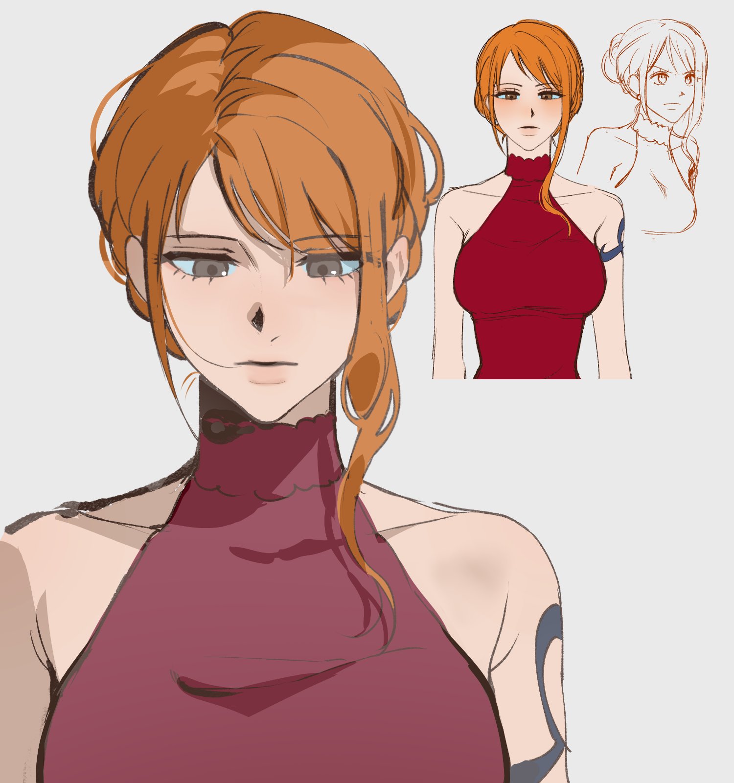 1girl 2025 bare_shoulders breasts brown_eyes closed_mouth collarbone commentary_request dress hair_up highres korean_commentary large_breasts looking_down multiple_views nami_(one_piece) nami_(one_piece)_(whole_cake_island) official_alternate_costume official_alternate_hairstyle one_piece orange_hair ppyobong11 red_dress shoulder_tattoo simple_background single_sidelock sleeveless sleeveless_dress straight-on tattoo turtleneck turtleneck_dress upper_body