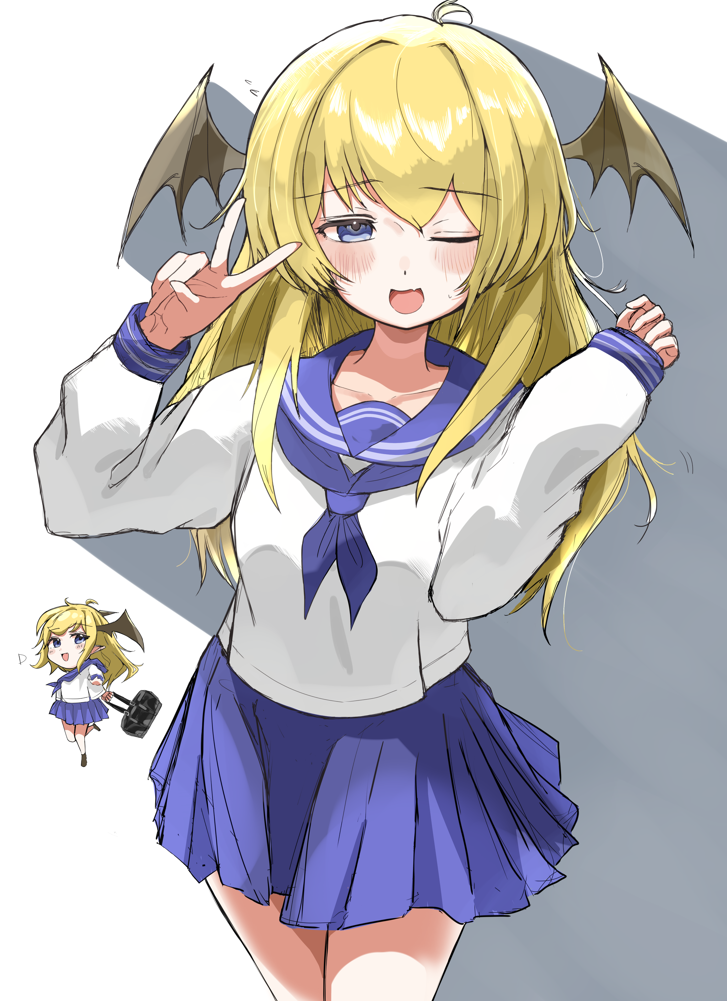 1girl absurdres alternate_costume alternate_hair_color blonde_hair blue_neckerchief blue_sailor_collar blue_skirt blush chibi chibi_inset commentary_request cookie_(touhou) cowboy_shot demon_girl demon_wings grey_wings head_wings highres koakuma long_hair looking_at_viewer neckerchief one_eye_closed open_mouth pleated_skirt sailor_collar school_uniform serafuku simple_background skirt smile sun_kajitsu touhou v white_background wings yuzuyu_(cookie)