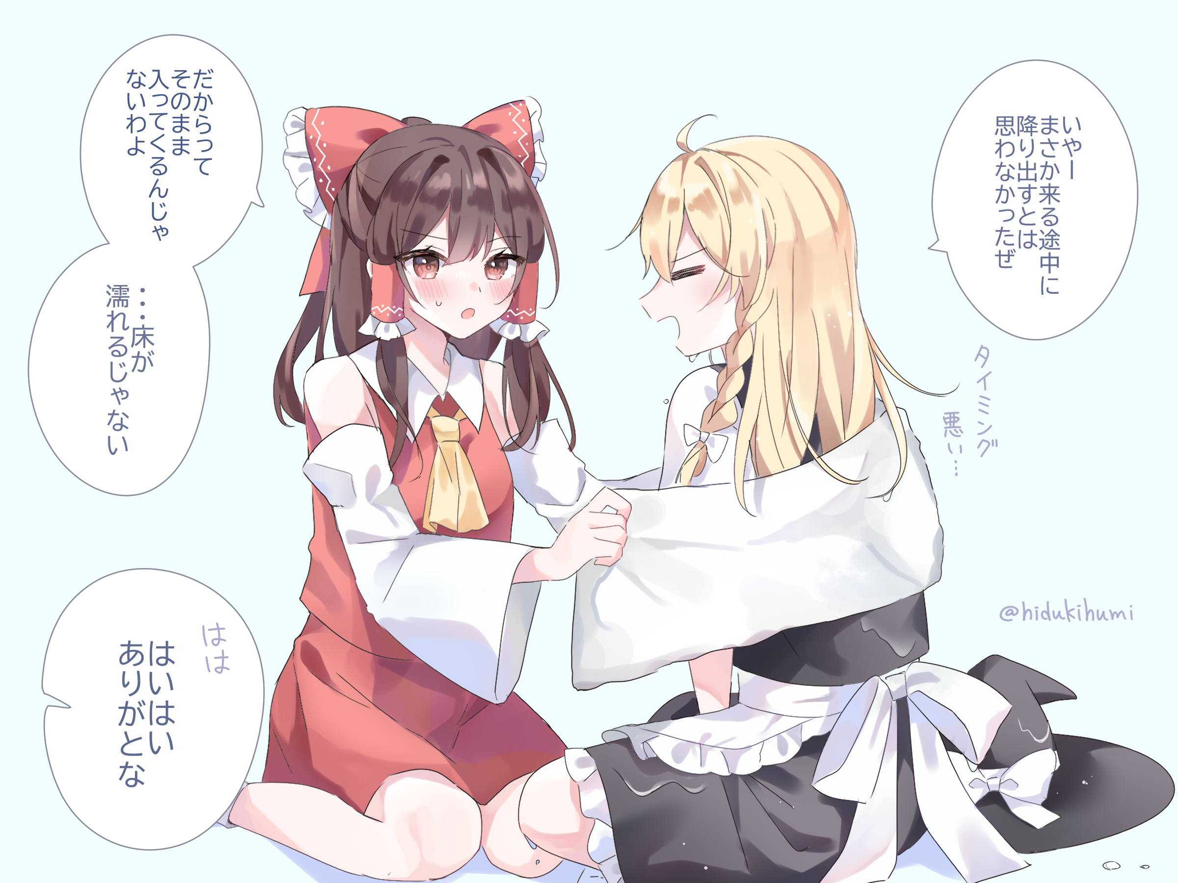 2girls ahoge apron ascot blonde_hair blue_background blush bow braid brown_eyes brown_hair closed_eyes commentary_request detached_sleeves dripping drying frilled_bow frilled_hair_tubes frills hair_bow hair_tubes hakurei_reimu hat hat_bow hidukihumi highres kirisame_marisa long_hair multiple_girls missing_headwear open_mouth red_bow red_skirt side_braid single_braid sitting skirt skirt_set speech_bubble sweatdrop touhou towel translation_request twitter_username unworn_headwear waist_apron water wet wet_clothes white_bow witch_hat yellow_ascot