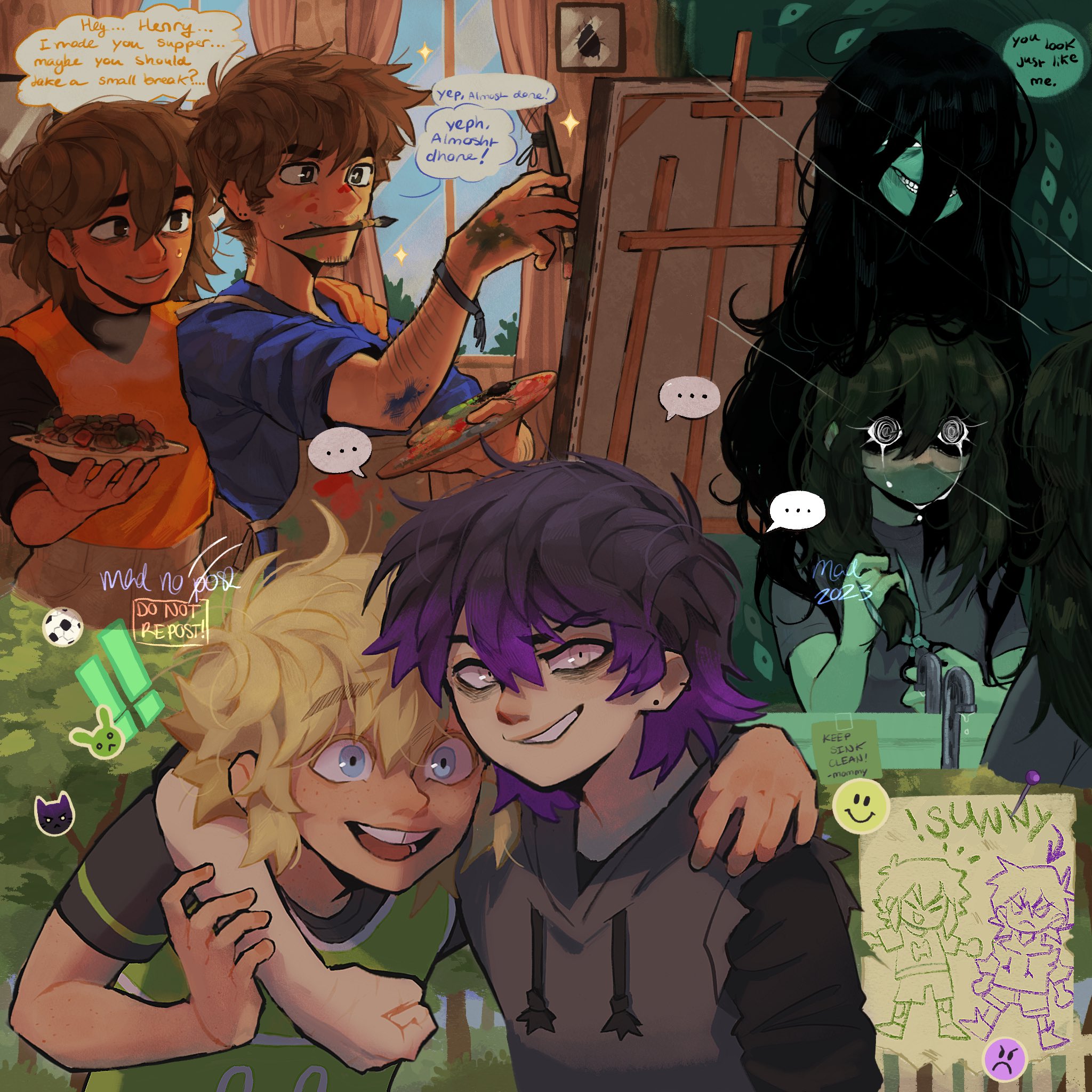 ... 1girl 2023 4boys @_@ alternate_costume alternate_hair_color alternate_hairstyle alternate_universe antenna_hair arm_around_neck aubrey_(faraway)_(omori) aubrey_(omori) bags_under_eyes basil_(faraway)_(omori) basil_(omori) black_hair blonde_hair blue_eyes blue_shirt brown_eyes brown_hair crying crying_with_eyes_open ear_piercing easel english_text faucet gradient_hair grey_hoodie grin hellmari_(omori) highres holding holding_paint_palette holding_plate hood hood_down hoodie kel_(faraway)_(omori) kel_(omori) long_hair looking_at_viewer madnopost multicolored_hair multiple_boys omori open_mouth paint_on_body paint_on_clothes paint_on_hands paint_palette paintbrush paintbrush_in_mouth parted_lips piercing plate purple_hair shirt short_hair short_sleeves sink smile something_(omori) speech_bubble spoken_ellipsis sunny_(omori) sweatdrop t-shirt tears teeth tongue white_eyes