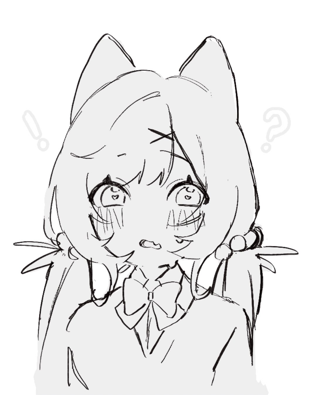 ! 1girl ? animal_ears blush bow bowtie cat_ears collared_shirt fang greyscale hair_bobbles hair_ornament heart heart-shaped_pupils highres long_hair looking_at_viewer low_twintails mikuron_0 monochrome open_mouth original shirt simple_background sketch skin_fang solo symbol-shaped_pupils twintails upper_body white_background x_hair_ornament