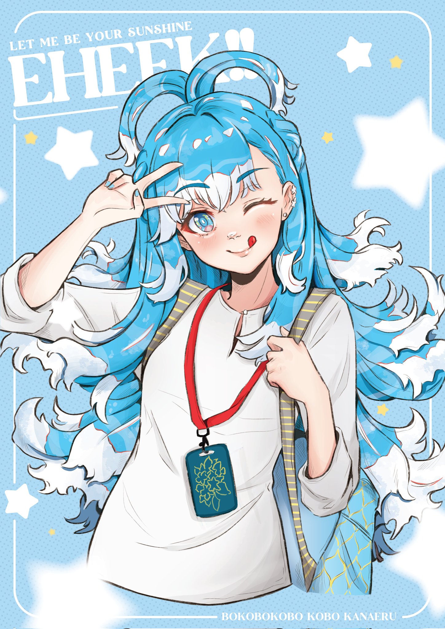 1girl aqil_ng bag baju_kurung blue_eyes blue_hair highres holding holding_bag hololive hololive_indonesia kobo_kanaeru lanyard liquid_hair long_hair looking_at_viewer malaysian_secondary_school_uniform multicolored_hair one_eye_closed school_uniform sleeves_rolled_up smile solo tongue tongue_out v virtual_youtuber white_hair