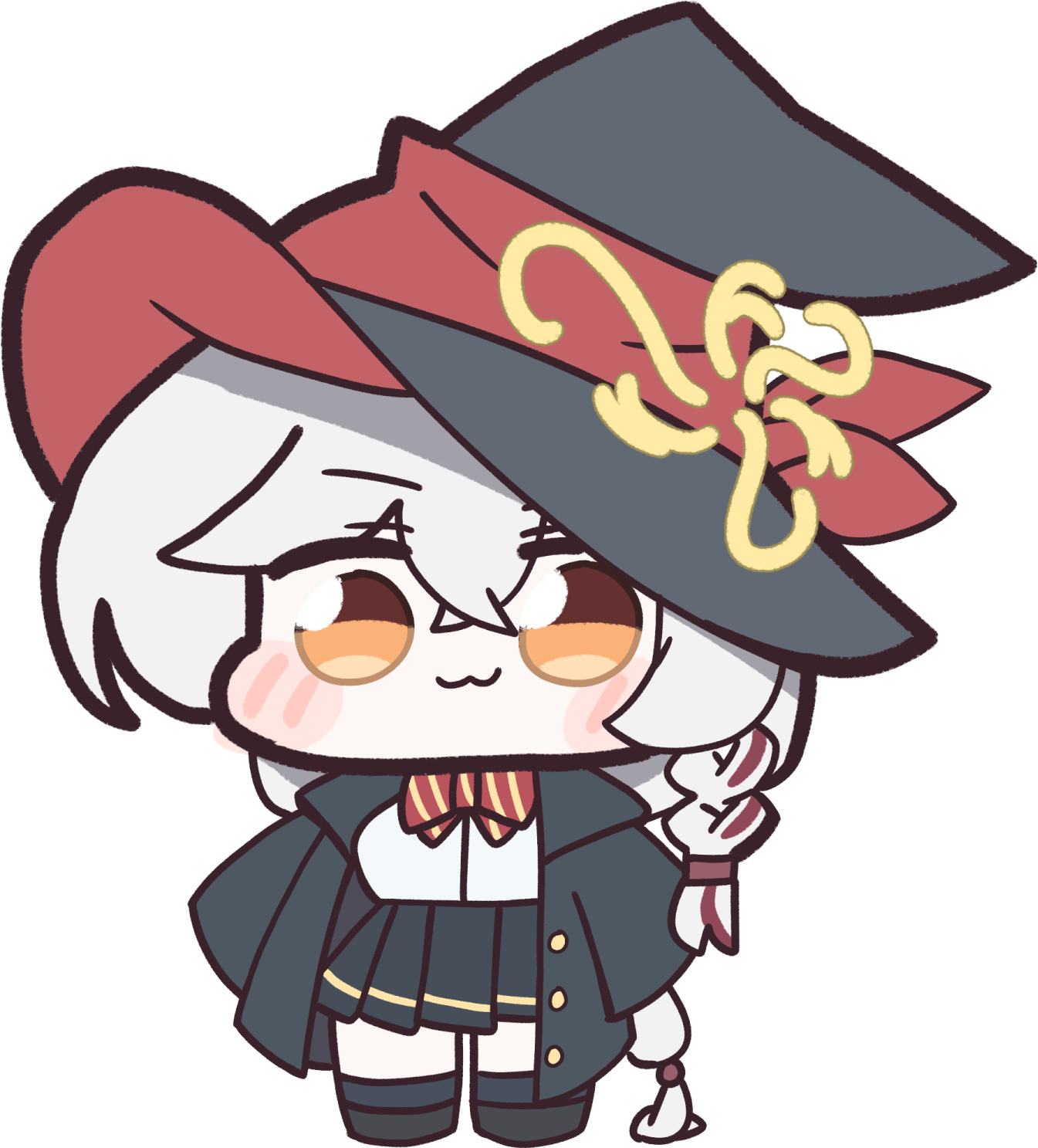 :3 blue_archive bow bowtie braid chibi eri_(blue_archive) halo hat hideinroom highres jacket long_coat long_hair orange_eyes shirt shoes skirt socks sweater white_hair witch_hat