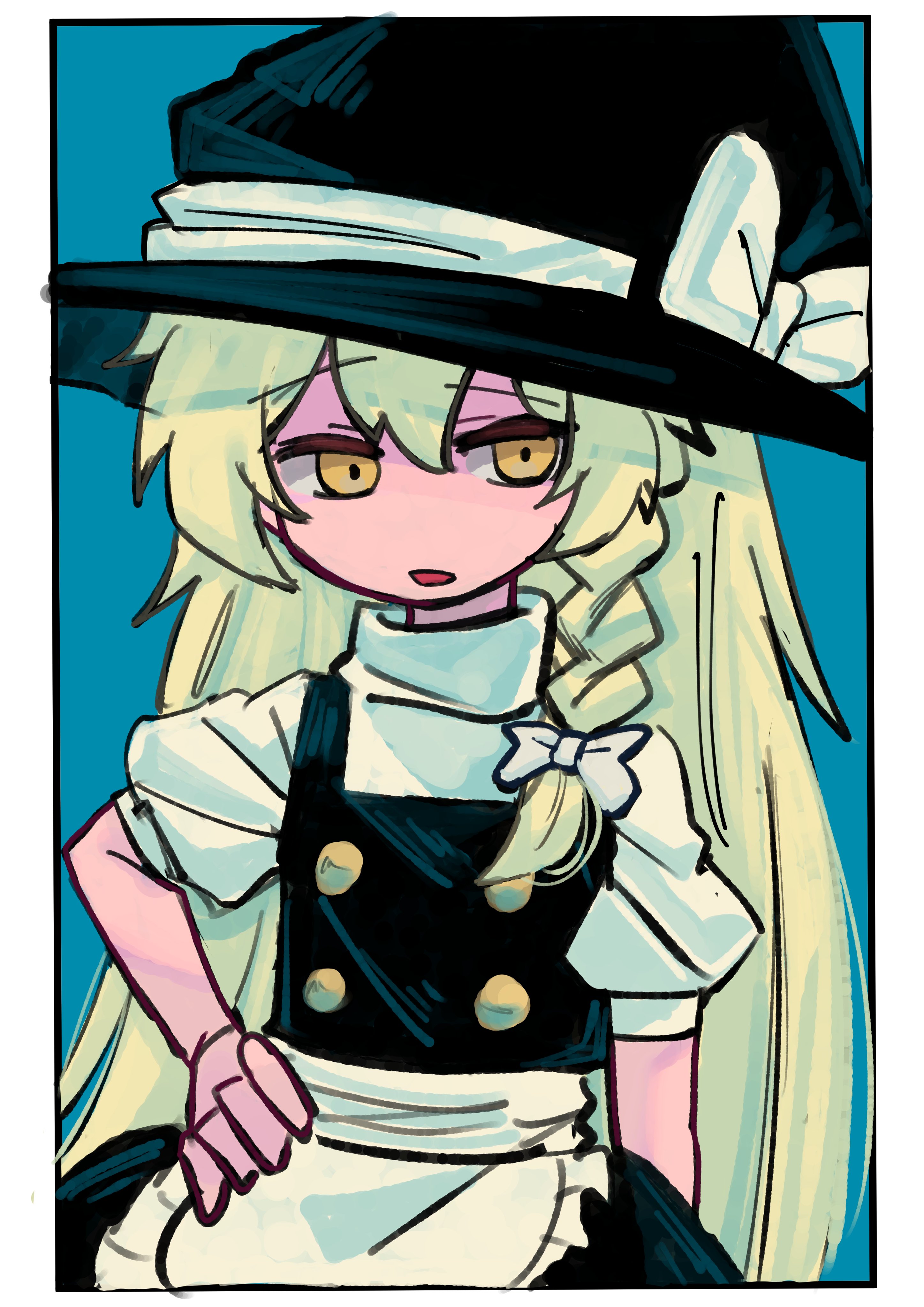 1girl absurdres apron bad_id bad_twitter_id black_dress blonde_hair blue_background border bow braid commentary dress frilled_apron frills hair_bow hand_on_own_hip hat hat_bow highres kirisame_marisa long_hair open_mouth pinafore_dress puffy_short_sleeves puffy_sleeves shikemoku shirt short_sleeves sleeveless sleeveless_dress solo touhou very_long_hair waist_apron white_apron white_border white_bow white_shirt witch witch_hat yellow_eyes