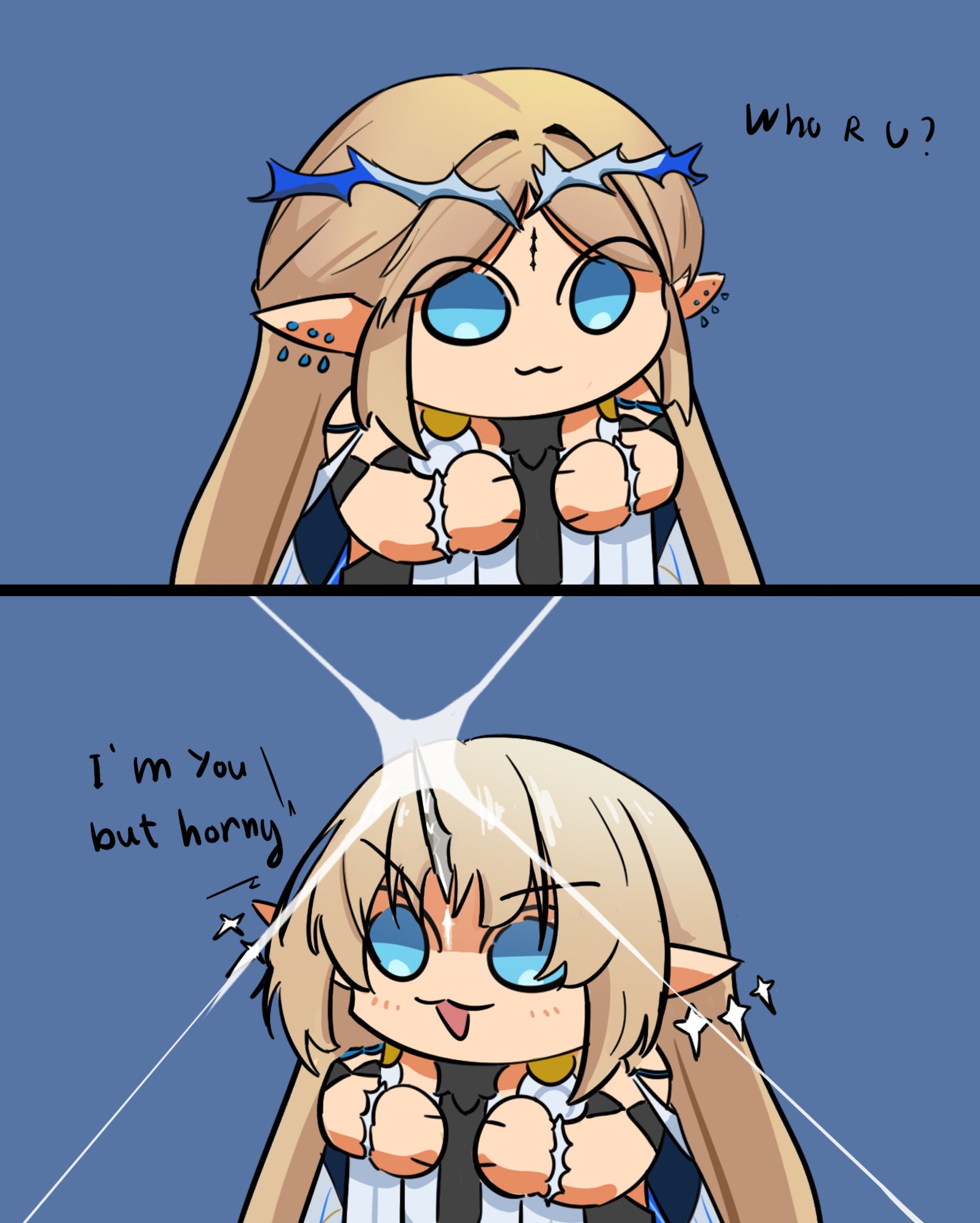 2girls :3 blonde_hair blue_background cartethyia_(wuthering_waves) closed_mouth commentary dual_persona earrings english_text fleurdelys_(wuthering_waves) floating_earrings hashtag-only_commentary highres horns jewelry lennykaise long_hair multiple_earrings multiple_girls open_mouth parted_bangs pointy_ears sidelocks single_horn tacet_mark_(wuthering_waves) wuthering_waves