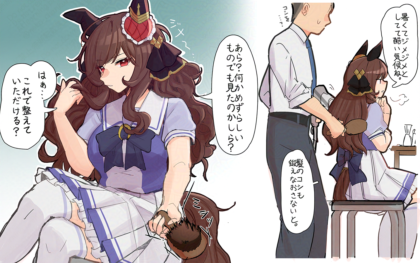 1boy 1girl animal_ears brown_hair ear_covers ear_ornament gentildonna_(umamusume) hair_down heart-shaped_ornament heart_ear_ornament horse_ears horse_girl horse_tail messy_hair noko-chan school_uniform speech_bubble tail tracen_school_uniform trainer_(umamusume) translation_request umamusume