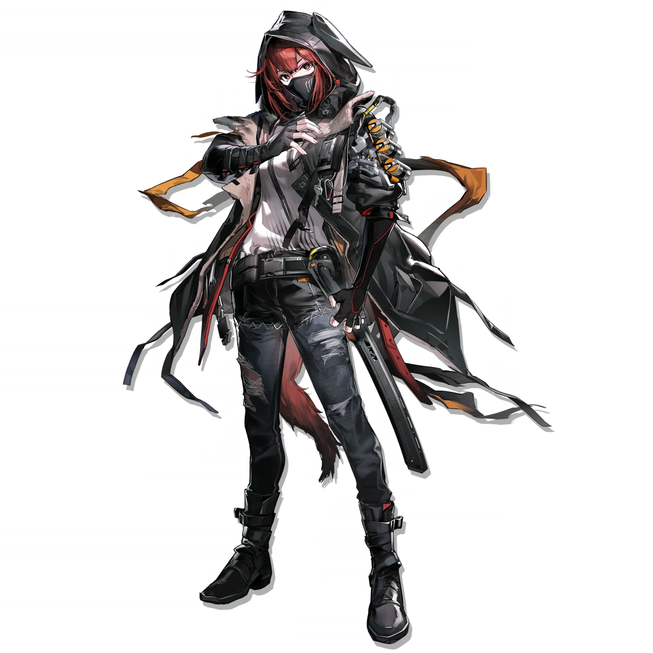 1girl animal_ear_hood arknights armband belt black_mask boots covered_mouth crownslayer_(arknights) denim drop_shadow elbow_gloves fake_animal_ears fingerless_gloves floating_clothes full_body gloves hand_on_own_chest highres hood hood_up hyena_tail jacket jeans mask mouth_mask official_art open_clothes open_jacket orange_armband pants patchwork_clothes red_eyes red_hair scabbard sheath sheathed shirt short-sleeved_jacket short_sleeves tachi-e tail torn_clothes torn_pants transparent_background white_shirt zhili_xingzou