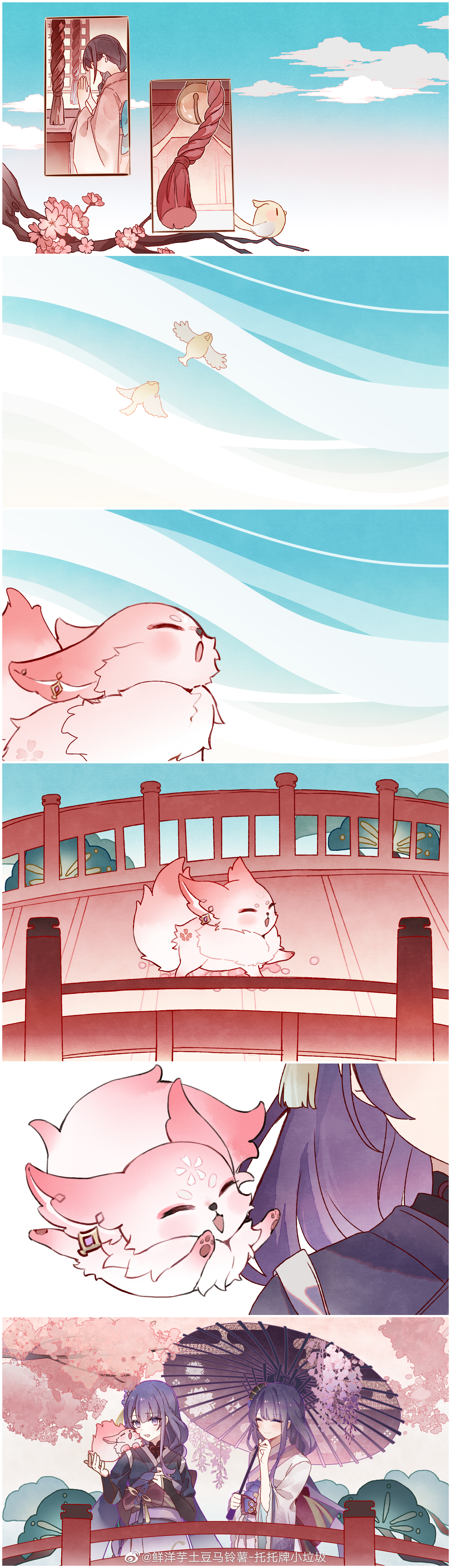 1other 3girls absurdres animal animal_ear_piercing animal_on_shoulder back_bow bird blue_sky blunt_bangs bow braid branch bridal_gauntlets bridge brown_hair cherry_blossoms chinese_commentary closed_eyes closed_mouth cloud cloudy_sky fan_hair_ornament flower flower_ornament fox fox_girl from_side genshin_impact hair_ornament hand_on_own_chin hands_up highres holding holding_umbrella japanese_clothes kimono light_blush light_smile long_braid long_hair long_sleeves looking_at_animal looking_down looking_to_the_side makoto_(genshin_impact) multicolored_hair multiple_girls neck_ribbon official_alternate_costume oil-paper_umbrella open_mouth outdoors own_hands_together pink_fur pink_kimono purple_flower purple_hair purple_kimono raiden_shogun red_ribbon red_sash ribbon sash shade siblings single_braid sisters sky sleeves_rolled_up spoilers standing streaked_hair tree twins umbrella wide_sleeves wisteria xianyangyutoumalingshu yae_miko yae_miko_(fox)
