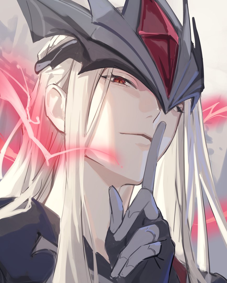1boy blonde_hair commentary finger_to_mouth grey_background kota_uro league_of_legends long_hair looking_at_viewer male_focus portrait red_eyes shushing solo t1_yone yone_(league_of_legends)