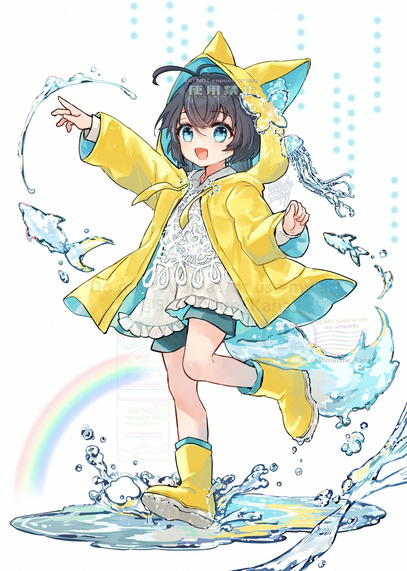 1girl ahoge animal_ear_hood animal_ears blue_eyes blue_shorts boots bug butterfly coat commentary_request fake_animal_ears fish full_body hood insect jellyfish long_hair long_sleeves looking_at_viewer open_mouth original pocket puddle rainbow raincoat rubber_boots shiromine_kana shirt shorts simple_background smile solo standing standing_on_one_leg tail walking water_drop watermark white_background white_shirt yellow_boots yellow_coat yellow_raincoat