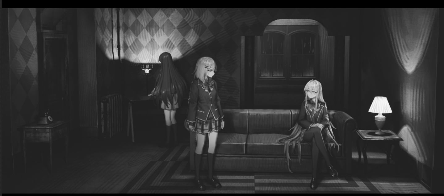 3girls amaori_renako bow bowtie commentary_request couch greyscale hair_between_eyes hair_ornament hairclip indoors jacket kneehighs koto_satsuki long_hair long_sleeves medium_hair monochrome multiple_girls ouzuka_mai pantyhose plaid_clothes plaid_skirt pleated_skirt sitting skirt socks standing unfinished very_long_hair watashi_ga_koibito_ni_nareru_wake_naijan_murimuri! yurika-r