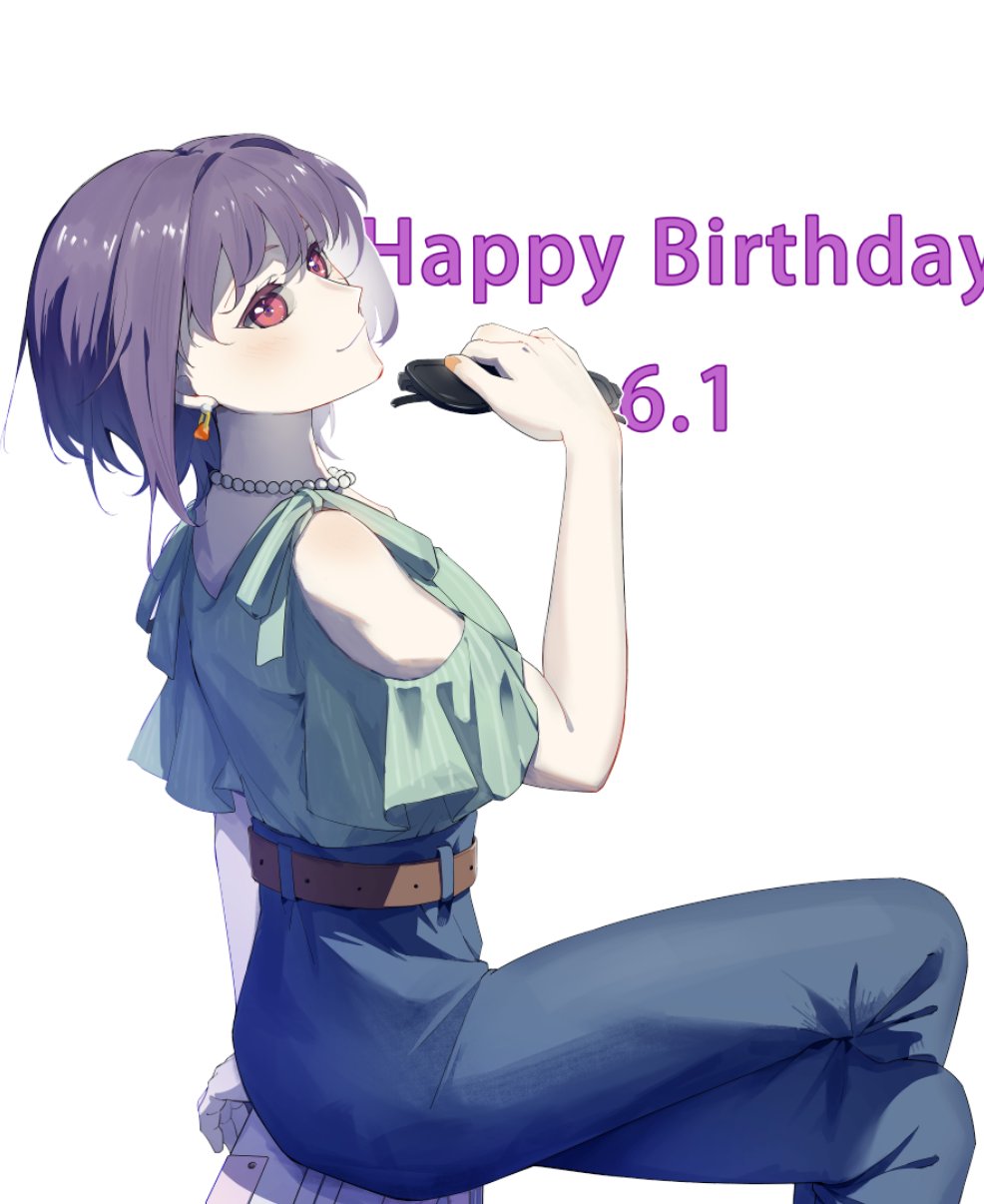 1girl bang_dream! bang_dream!_it's_mygo!!!!! bead_necklace beads blue_pants clothing_cutout commentary dated earrings green_shirt happy_birthday hayashi_mujina highres jewelry necklace pants pink_eyes purple_hair shirt short_hair shoulder_cutout simple_background solo white_background yuutenji_nyamu