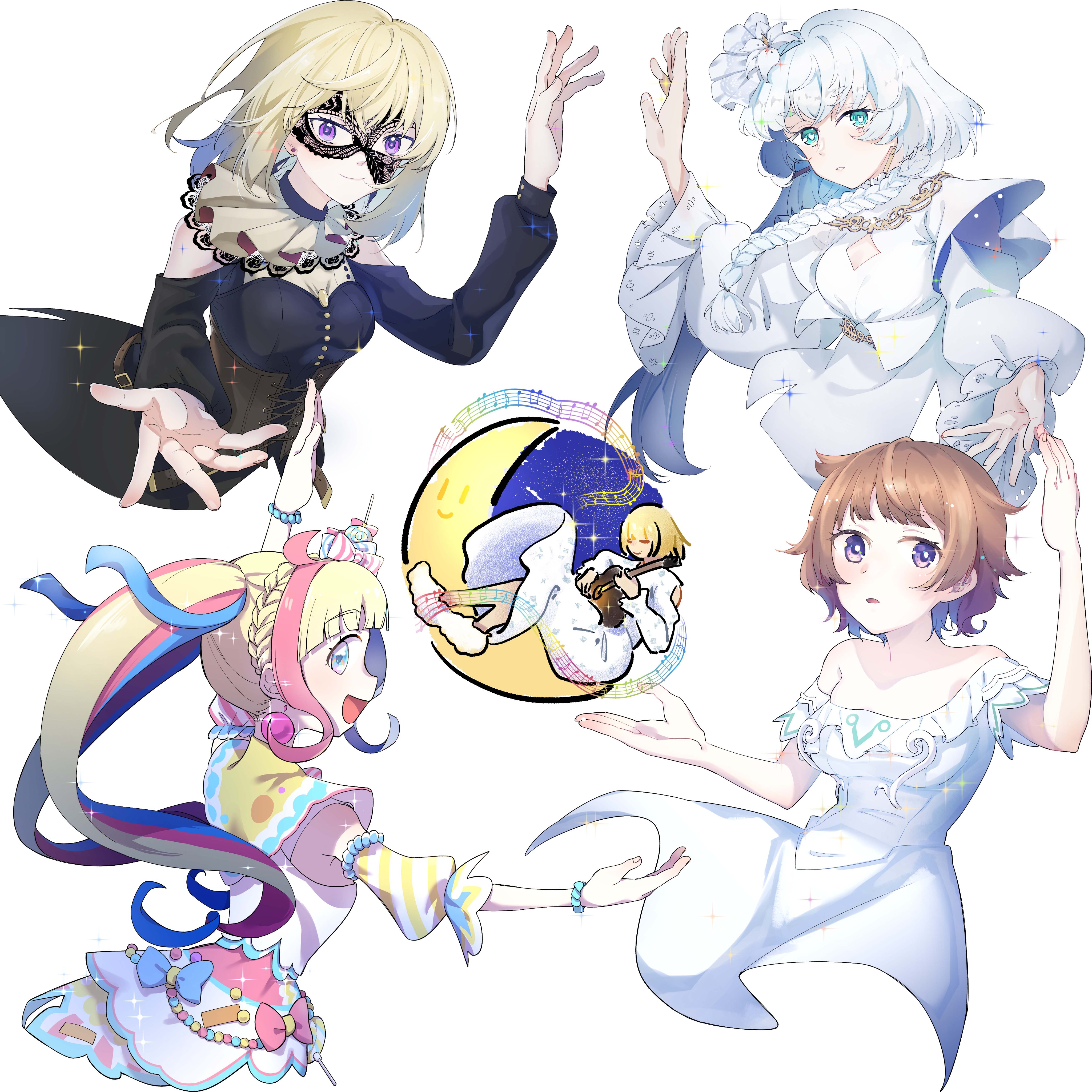 5girls absurdres acoustic_guitar black_mask blonde_hair blue_eyes brown_corset brown_hair character_request commentary_request copyright_request corset daia_(pri_chan) doloris_(bang_dream!) dress flower_stand_art guitar hayashi_mujina highres instrument kiratto_pri_chan long_hair long_sleeves mask masquerade_mask misumi_uika multiple_girls open_mouth pretty_series purple_eyes sasaki_rico_(voice_actor) sasuga_chisa short_sleeves voice_actor voice_actor_connection white_dress white_hair world_dai_star